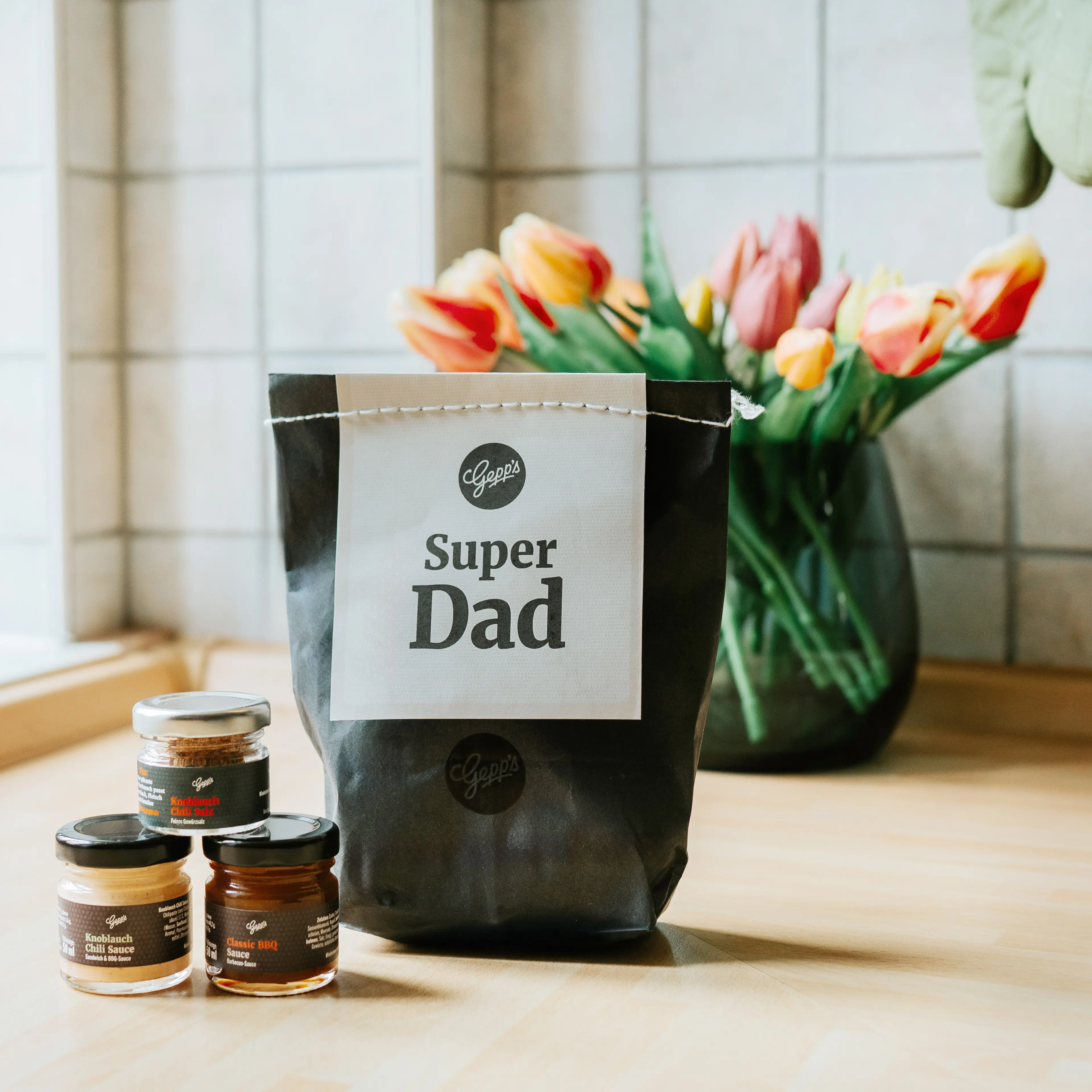 Am 14. Mai ist Vatertag! Wenn Papa „nur kurz“ an den Grill geht, weißt du: Das kann dauern – und wird lecker. Die Wundertüte Mini „Super Dad“ liefert dafür das passende Trio: eine Mini Knoblauch Chili Sauce für den pikanten Kick, eine Mini BBQ Sauce für den rauchig-süßen Klassiker und ein Mini Knoblauch Chili Salz, das Pommes, Kartoffeln und Gemüse sofort auf Super-Dad-Niveau hebt. Ideal als kleine Aufmerksamkeit zum Vatertag, zum Geburtstag oder einfach, weil er’s verdient hat.