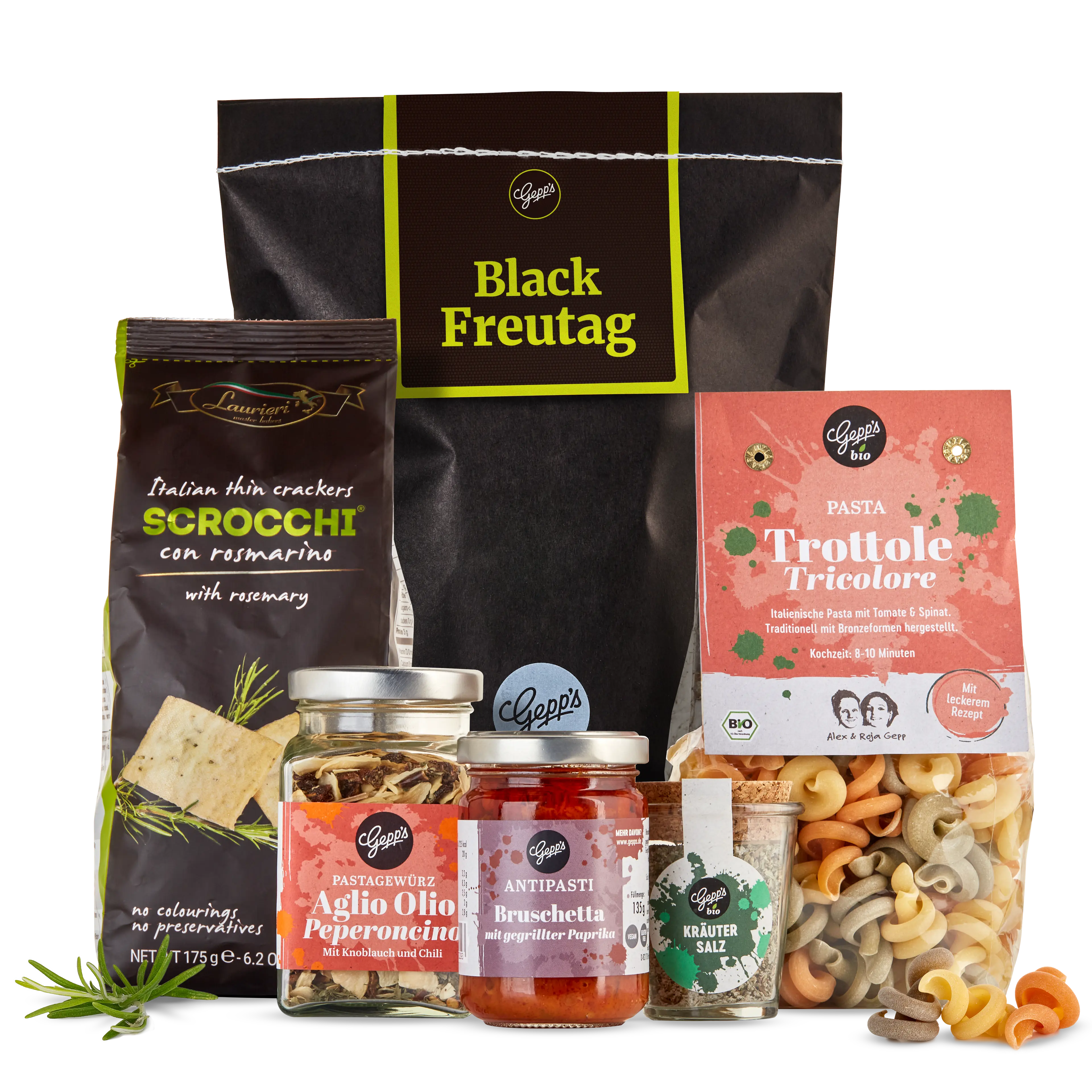 Die Wunderüte Black Freutag bringt fünf köstliche Feinkost-Favoriten direkt zu dir nach Hause – und sorgt für echte Glücksmomente am Herd und auf dem Teller. Knusprige Rosmarin Cracker laden zum Snacken ein, während die Trottole Pasta mit Tomate und Basilikum für italienisches Flair sorgt. Die Bruschetta mit gegrillter Paprika schmeckt nach Sommer und mediterraner Lebensfreude, das Aglio Olio Peperoncino Pastagewürz bringt feurige Würze für schnelle Pasta-Gerichte. Abgerundet wird das Set mit dem Bio Kräutersalz, das jedem Gericht die perfekte Prise Genuss verleiht. Ob als Geschenk für Feinschmecker oder als kulinarische Überraschung für dich selbst – die Wunderüte ist ein Fest für alle, die hochwertige Zutaten und kreative Küche lieben. Wie immer bei Gepp’s: Ohne künstliche Zusätze, dafür mit viel Herz und Geschmack.