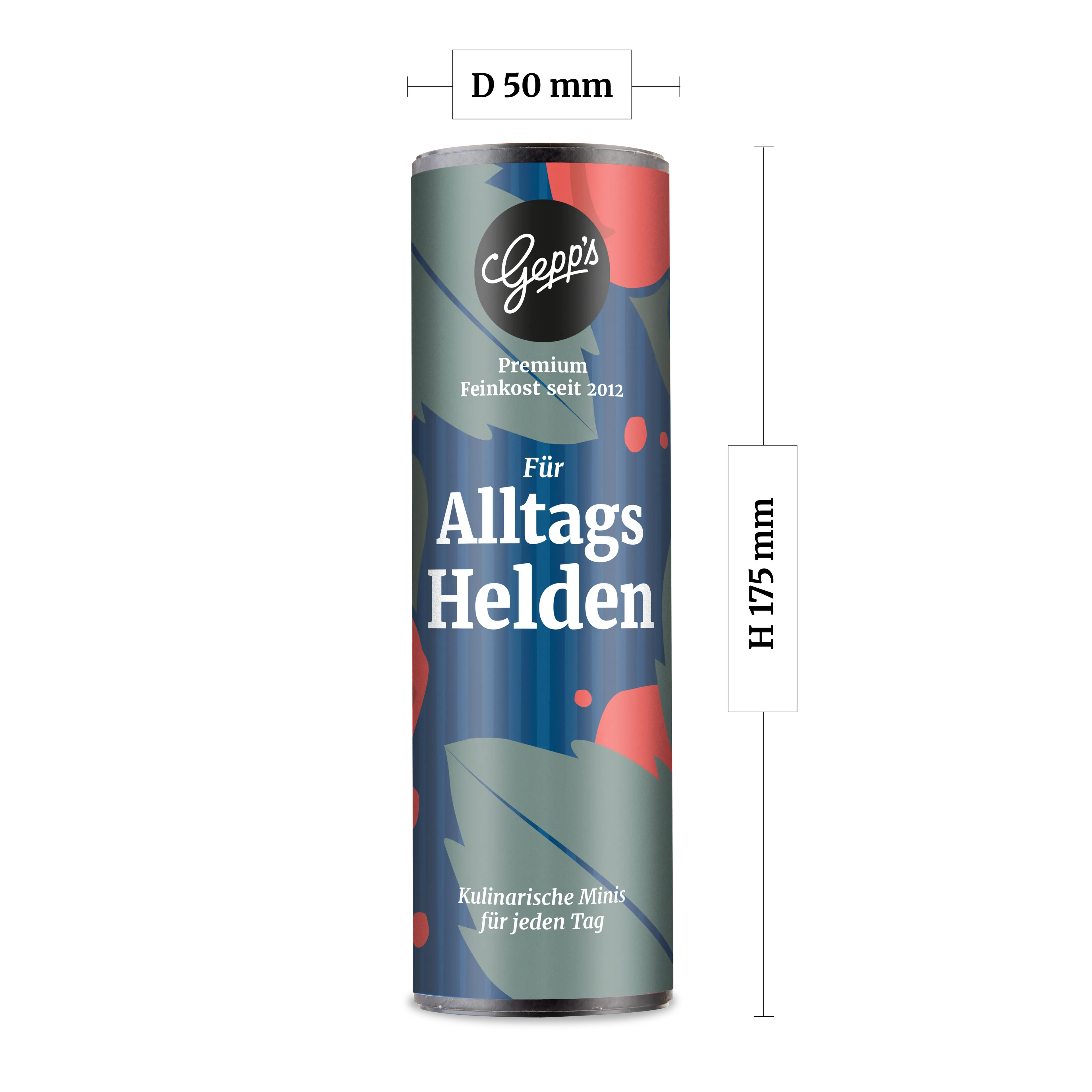 Besonders die stillen Helden im normalen Leben wie Papas und Mamas, Briefboten, verlässliche Kollegen oder beste Freundinnen haben dann und wann eine Anerkennung verdient. Und nicht irgendeine Anerkennung, sondern den Dank der leckersten Sorte. In der hübschen Pappröhre stecken in Mini-Ausgaben unsere Bestseller-Sauce Knobluach Chili: scharf und würzig zu Fleisch, Huhn und Gemüse vom Grill. Die Gewürzmischung Alleskönner ist unbedingt alltagstauglich – perfekt zu Suppen, Aufläufen, Pastasaucen, Dressings. Ein feuriger Untergrund zu Burgern, Würstchen und Tofu ist die feine Senfspezialität. Für Geschmacks-Highlights im Alltag!