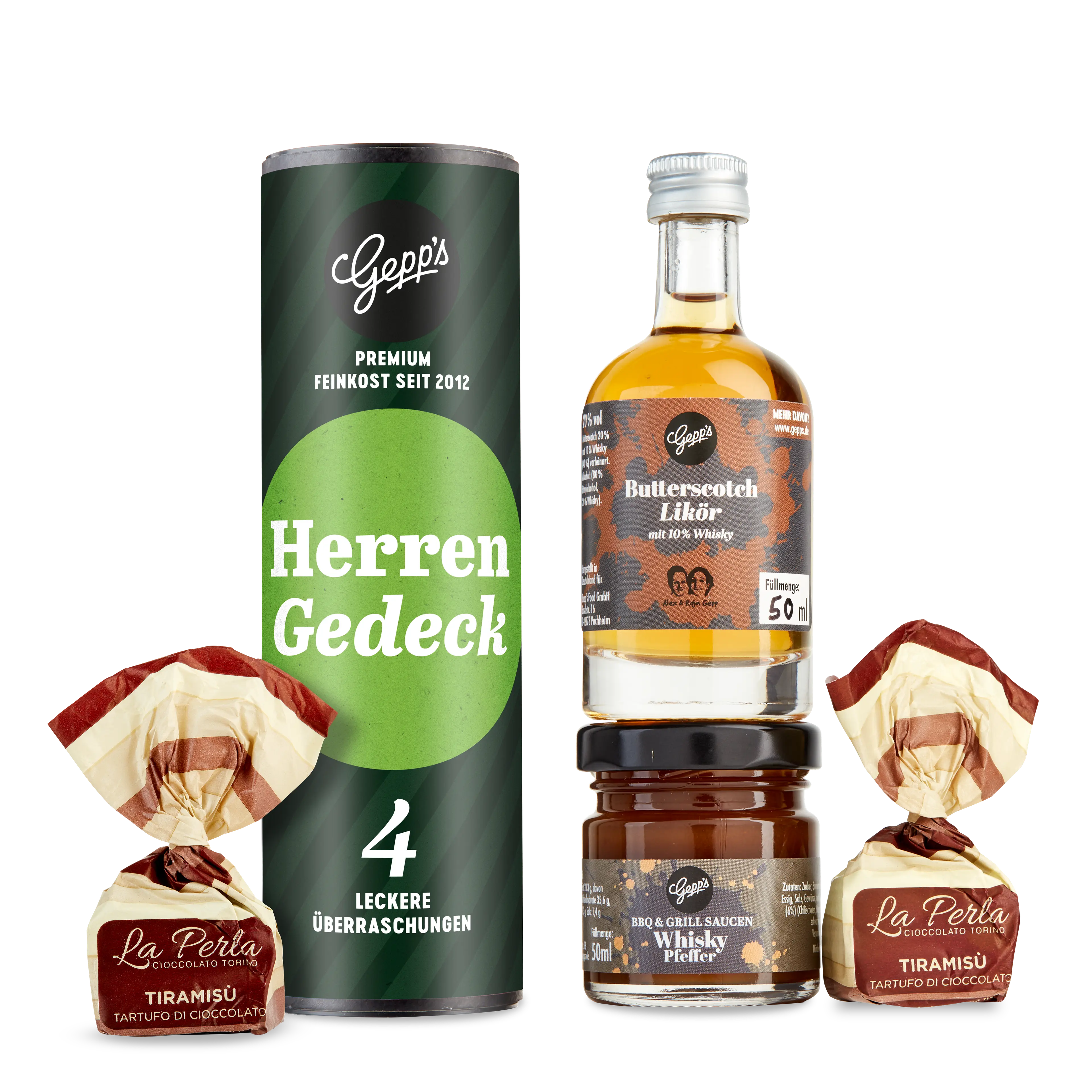 Für Männer mit Geschmack und Humor: Das Probierset „Herrengedeck“ ist das ideale Geburtstagsgeschenk für Väter, Freunde und Nachbarn, eine nette Geste für den Kollegen oder den Gastgeber. Wir haben das klassische Herrengedeck neu interpretiert: Die Whisky-Pfeffer-Sauce bringt leicht scharfen, rauchigen Geschmack an Gegrilltes, der Butterscotch-Likör den belebenden Geist an Desserts oder Kuchen und die italienischen Pralinen mit Tiramisu begleiten einen Espresso nach dem Essen stilecht.