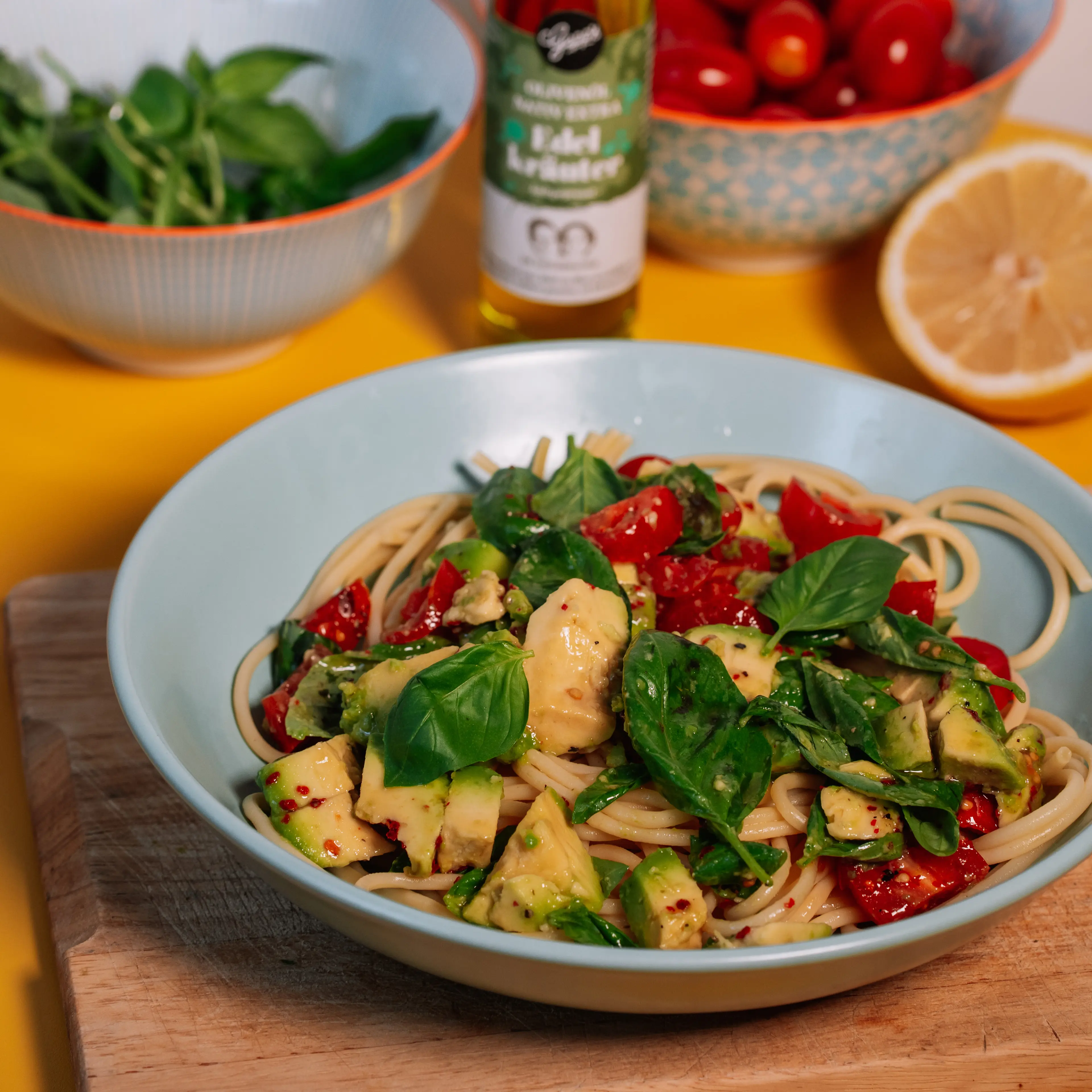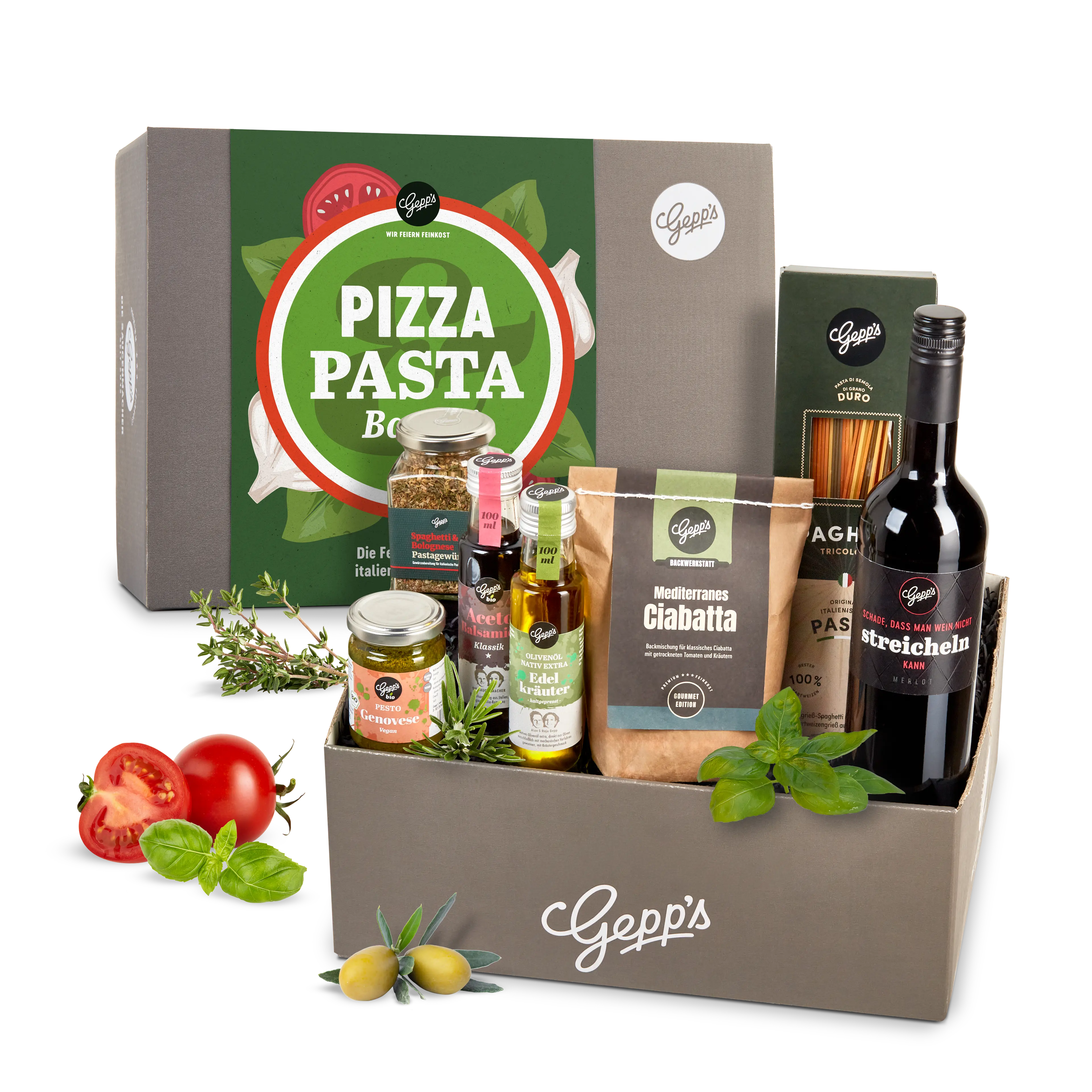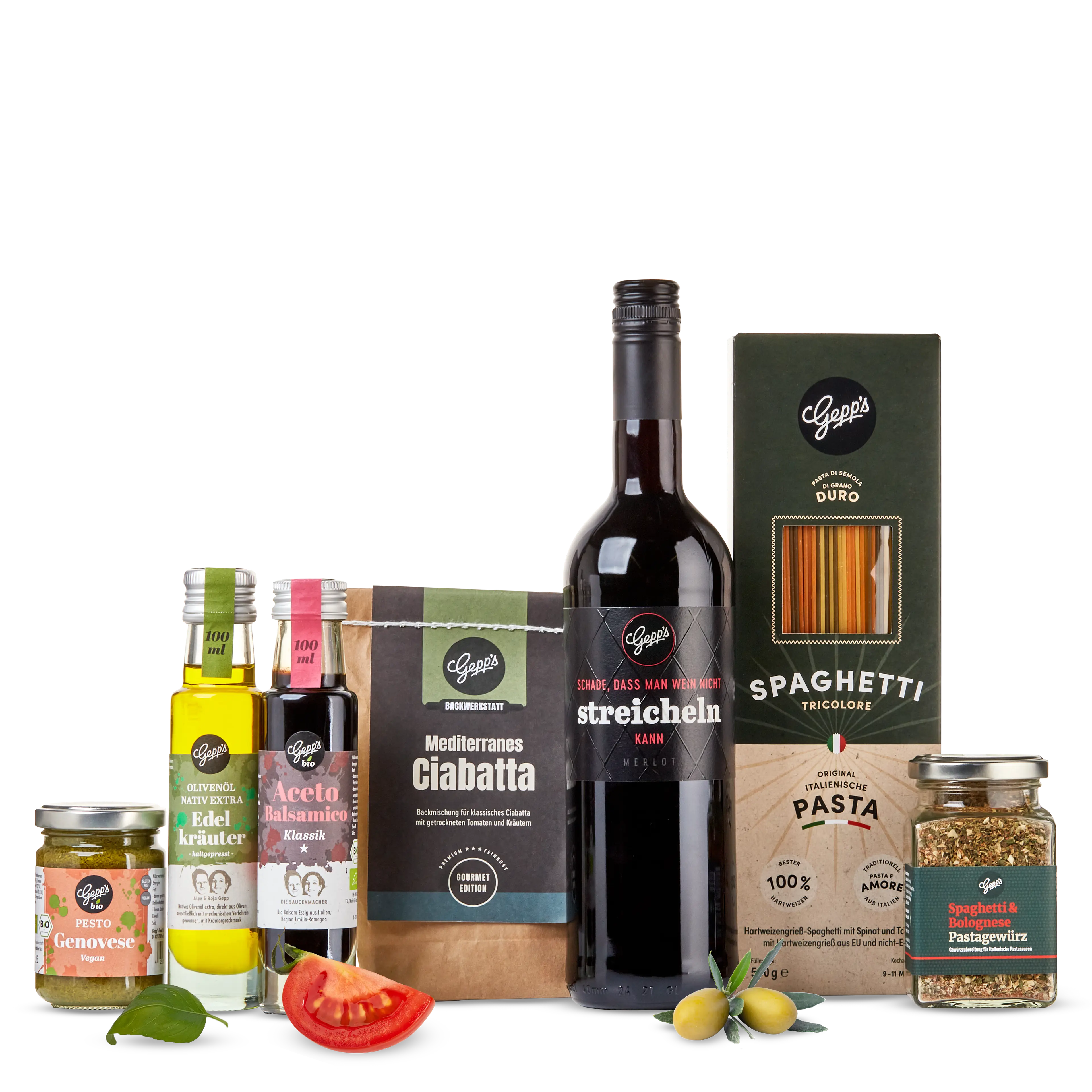 Spaghetti Tricolore (500 g), Olivenöl mit Edelkräutern (100 ml), Pastagewürz Spaghetti (120 g), Bio-Pesto Genovese (135 g), Backmischung Ciabatta Mediterran (500 g), Bio-Aceto Balsamico Klassik (100 ml), Flasche Merlot „Schade, dass man Wein nicht streicheln kann“ (0,75 l), Pizzaschneider