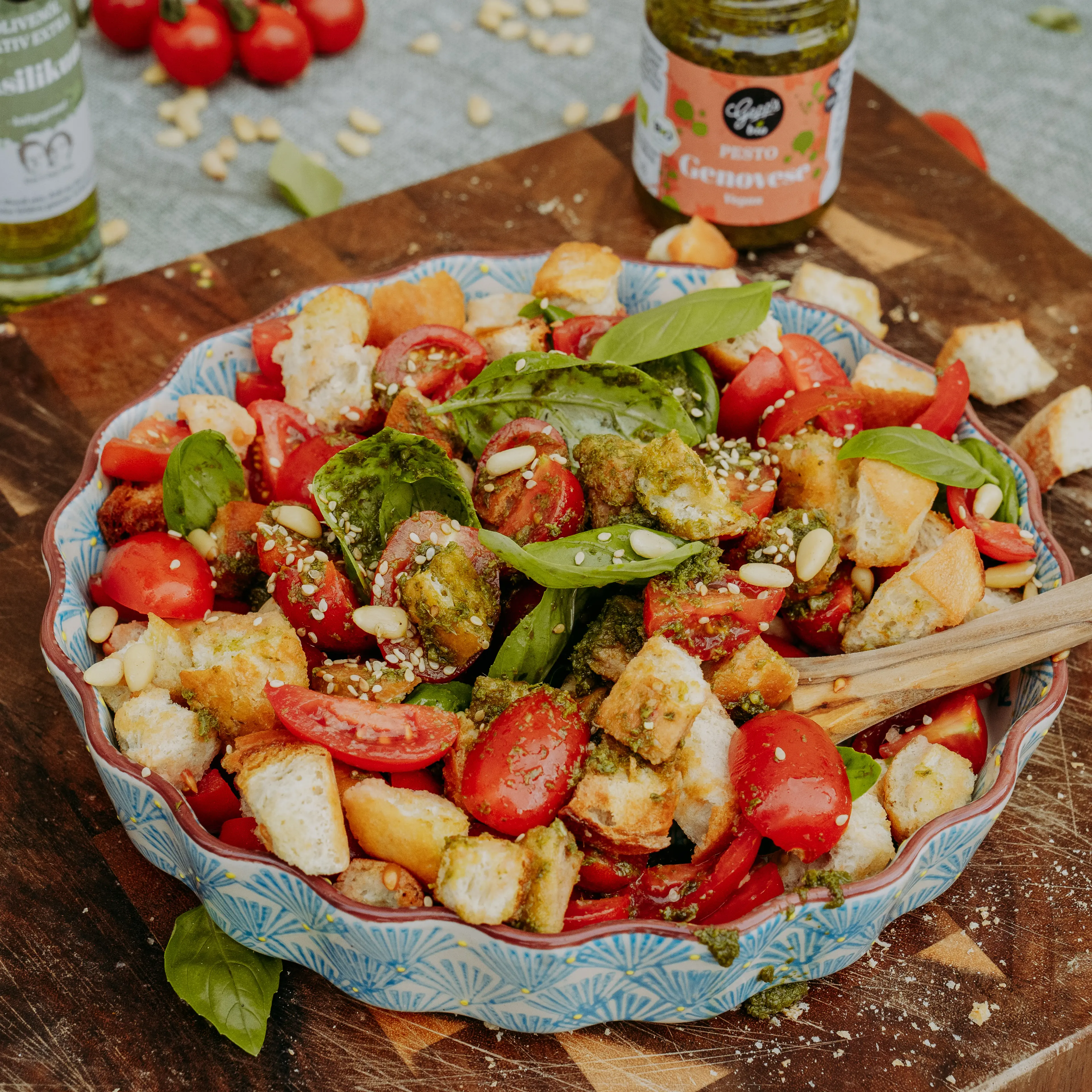 Tagliatelle (250 g), Bio Salsa Pronta Dattel Tomate (330 g), Bio Pesto Genovese (135 g), Bio Nudel Jubel Pastasalz (85 g)