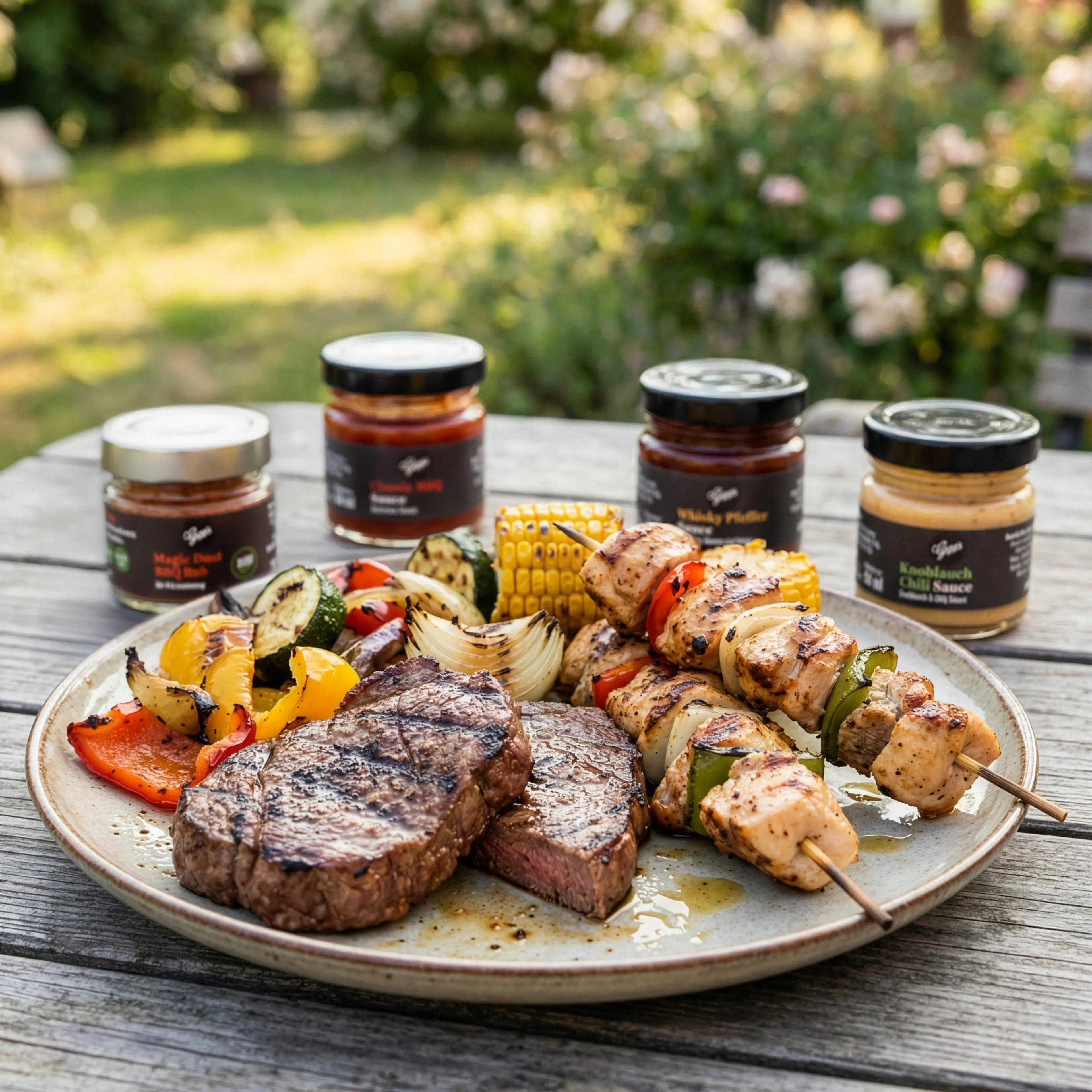 Du willst dich einmal durchs Grillregal testen? Dieses Mini-Set bringt dir eine bunte Auswahl an Saucen in Probiergröße – ideal für Grillabende, Picknick oder als kleines Geschenk. Von Mango-Chili über Whisky-Pfeffer und BBQ bis hin zu Knoblauch-Chili und Sesam ist alles dabei.