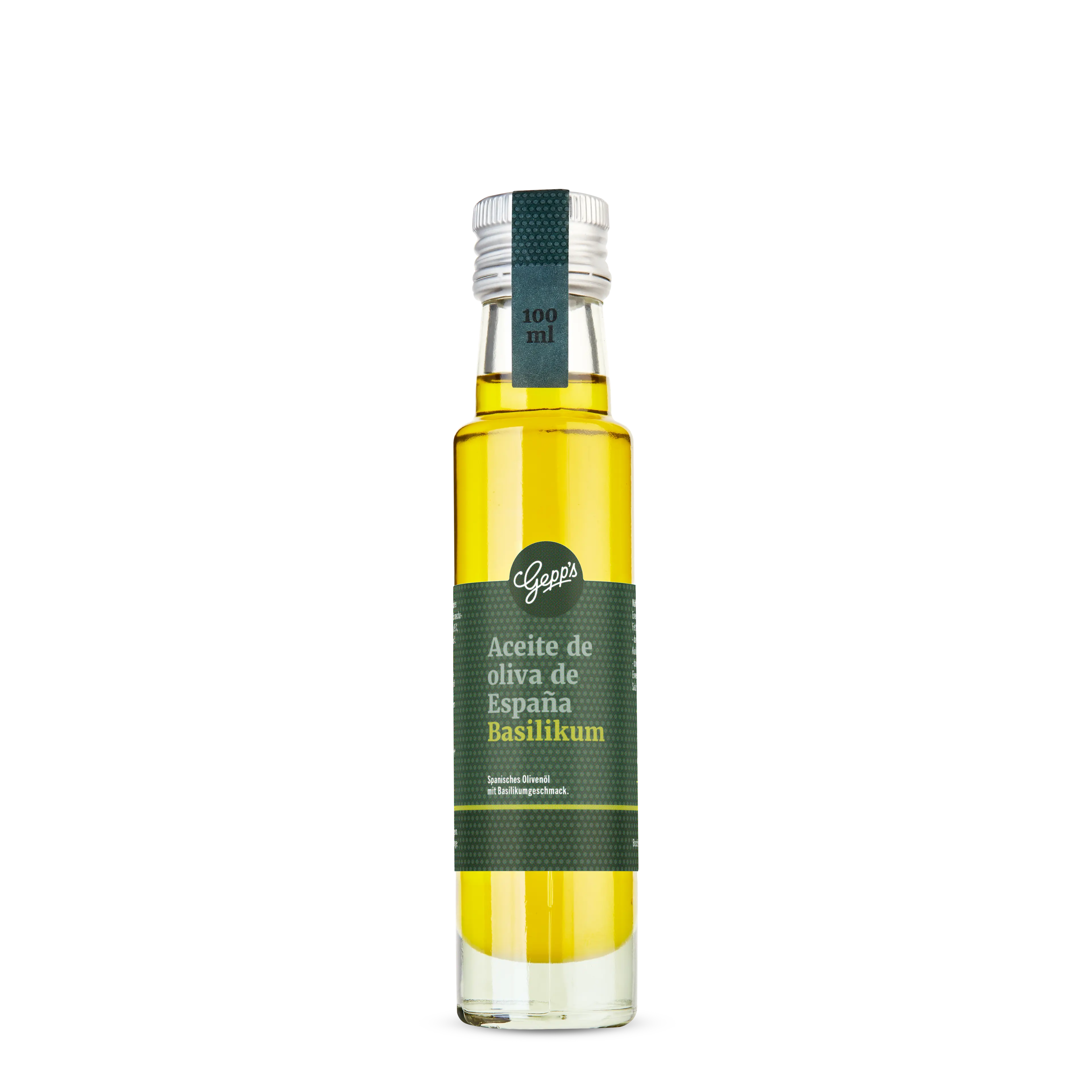 Kaltgepresstes natives Olivenöl extra* (ausschließlich mechanisch gewonnen) aus Spanien 95 %, natürliches Basilikumaroma 5 %.