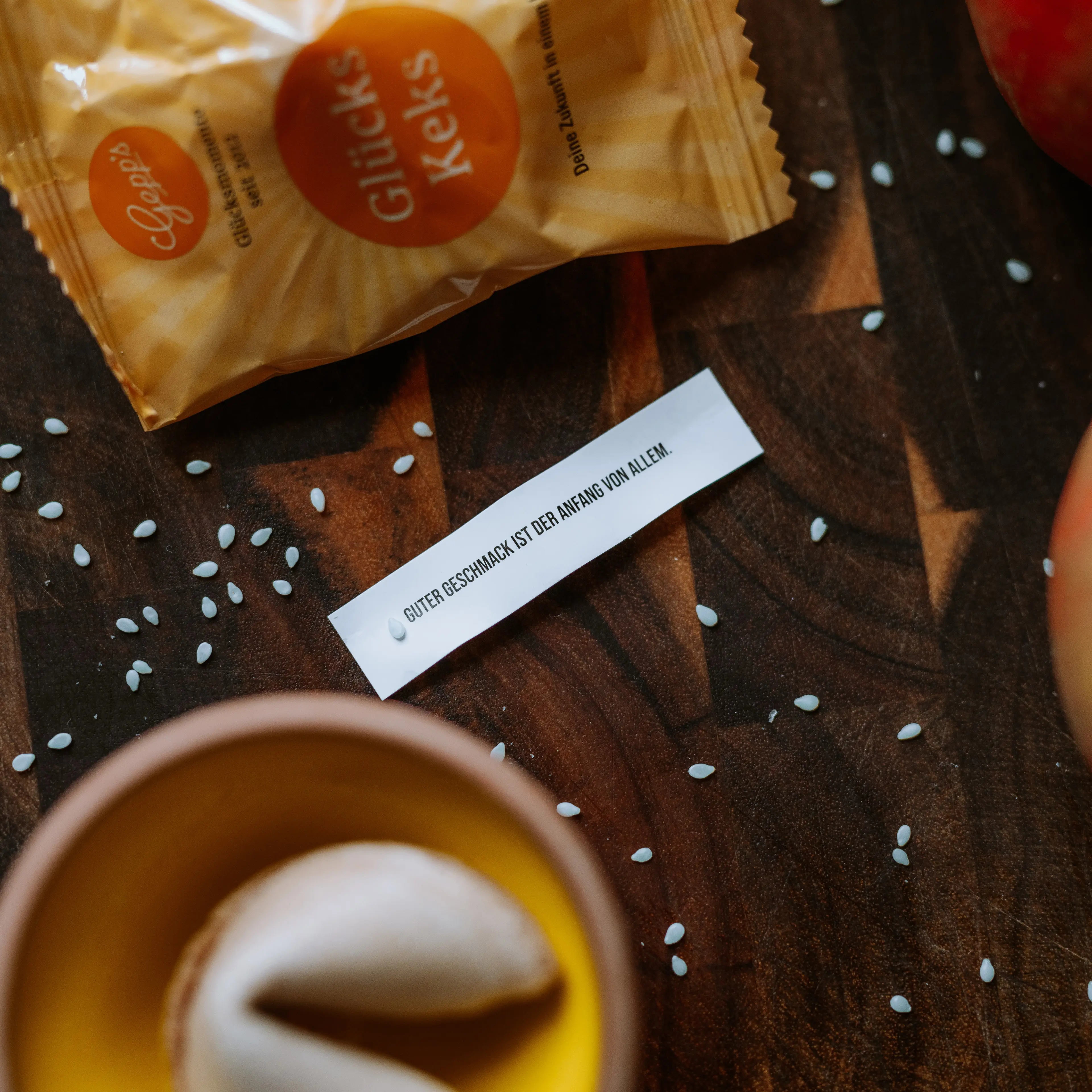 Torcetti al Burro (18 g), Pistazien (36 g), Grüne Oliven mit Wacholder (280 g), 2x Glückskekse (á 6 g), Zimtblüten Zucker (90 g)