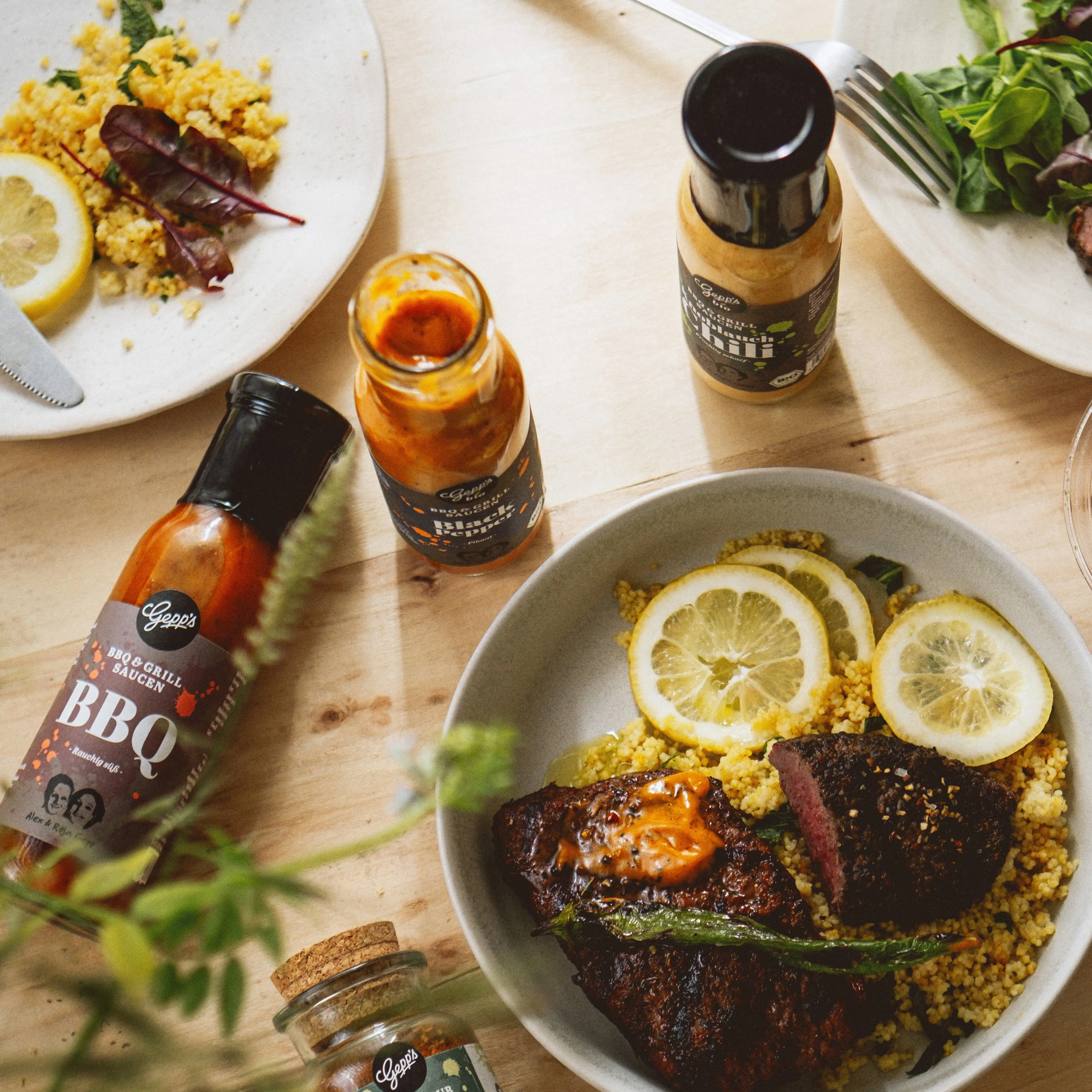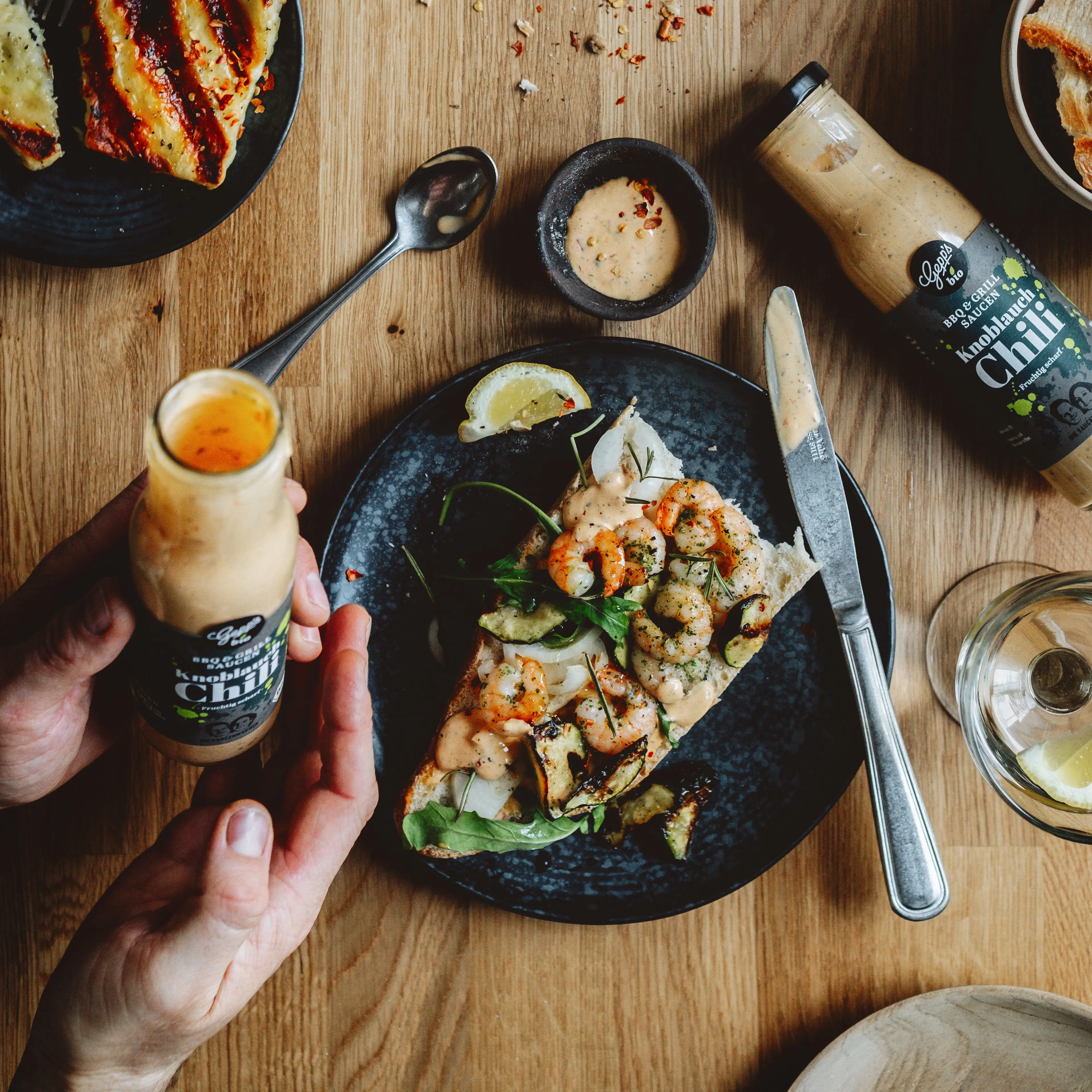 Unsere würzig scharfe Knoblauch-Chili-Sauce mit roten Chilischoten und Knoblauch zählt zu den absoluten Gepp’s Bestsellern. Sie macht sich nicht nur perfekt als Grillsauce zu Fleisch und Fisch, sondern ist auch wunderbar zum Marinieren von Scampis und als raffinierter Dip zu Fischfilets und Rindersteaks geeignet. Und auch Sandwiches und Burgern verleiht sie das gewisse Etwas. Unser Tipp: Einen Klecks davon in die Pastasauce geben, ergibt eine tolle cremige Schärfe!