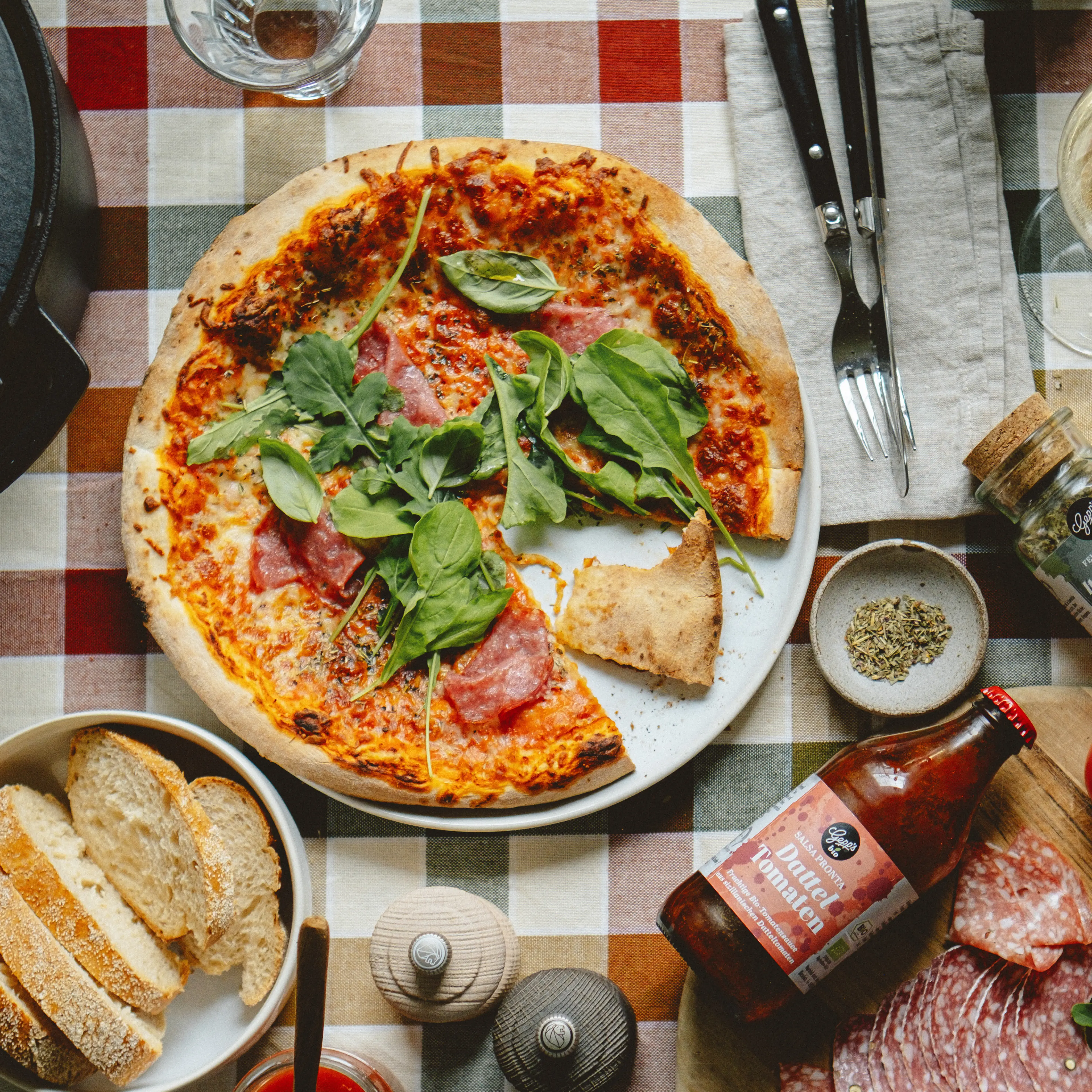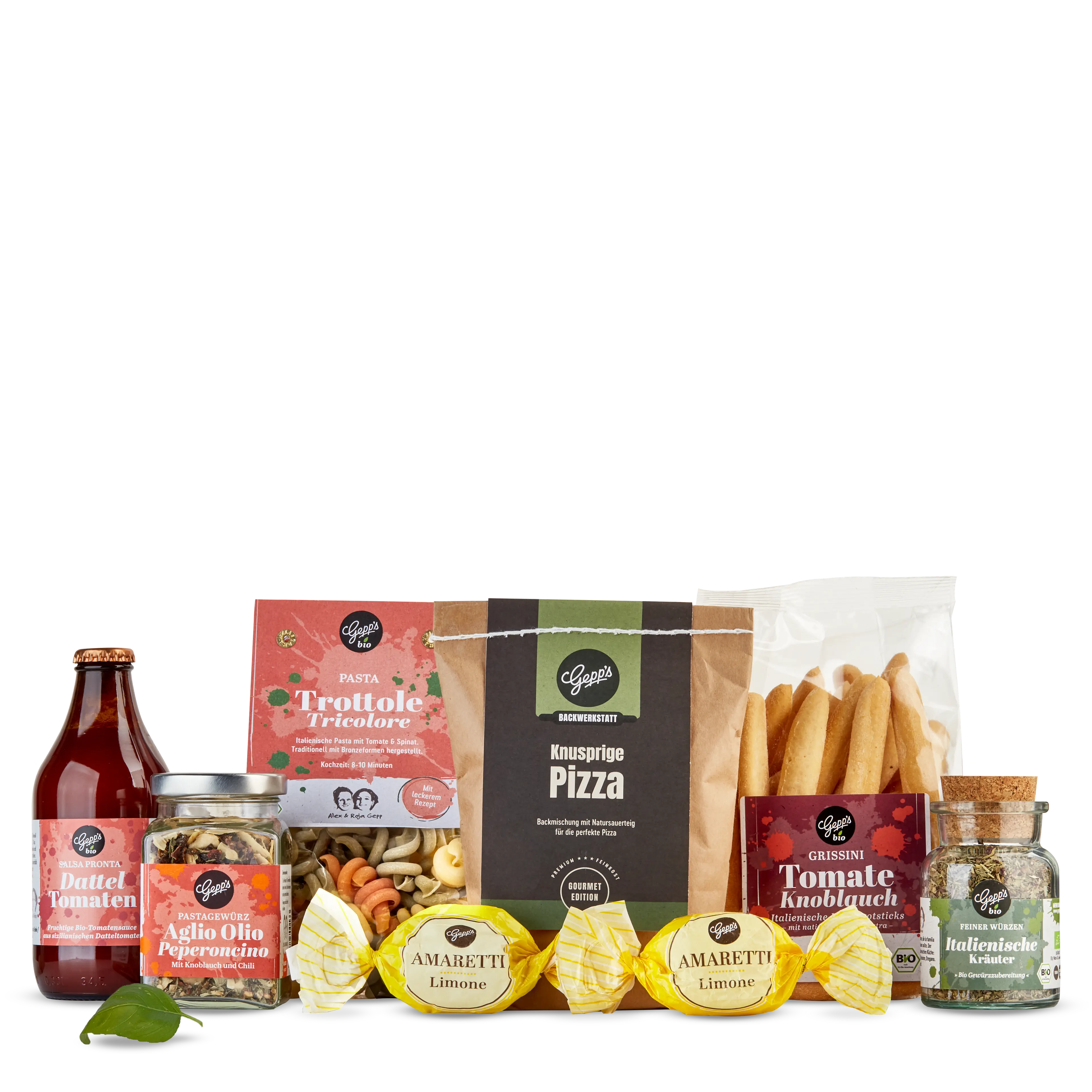 Bio Pasta Trottole Pomodoro E Basilico (250 g), Bio Grissini Tomate & Knoblauch (125 g), Aglio Olio Peperoncino Pastagewürz (80 g), Backmischung Pizza (500 g), Bio Salsa Pronta Dattel Tomate (330 g), 2x Amaretto Limone (á 20 g), Bio Italienische Kräuter (30 g)