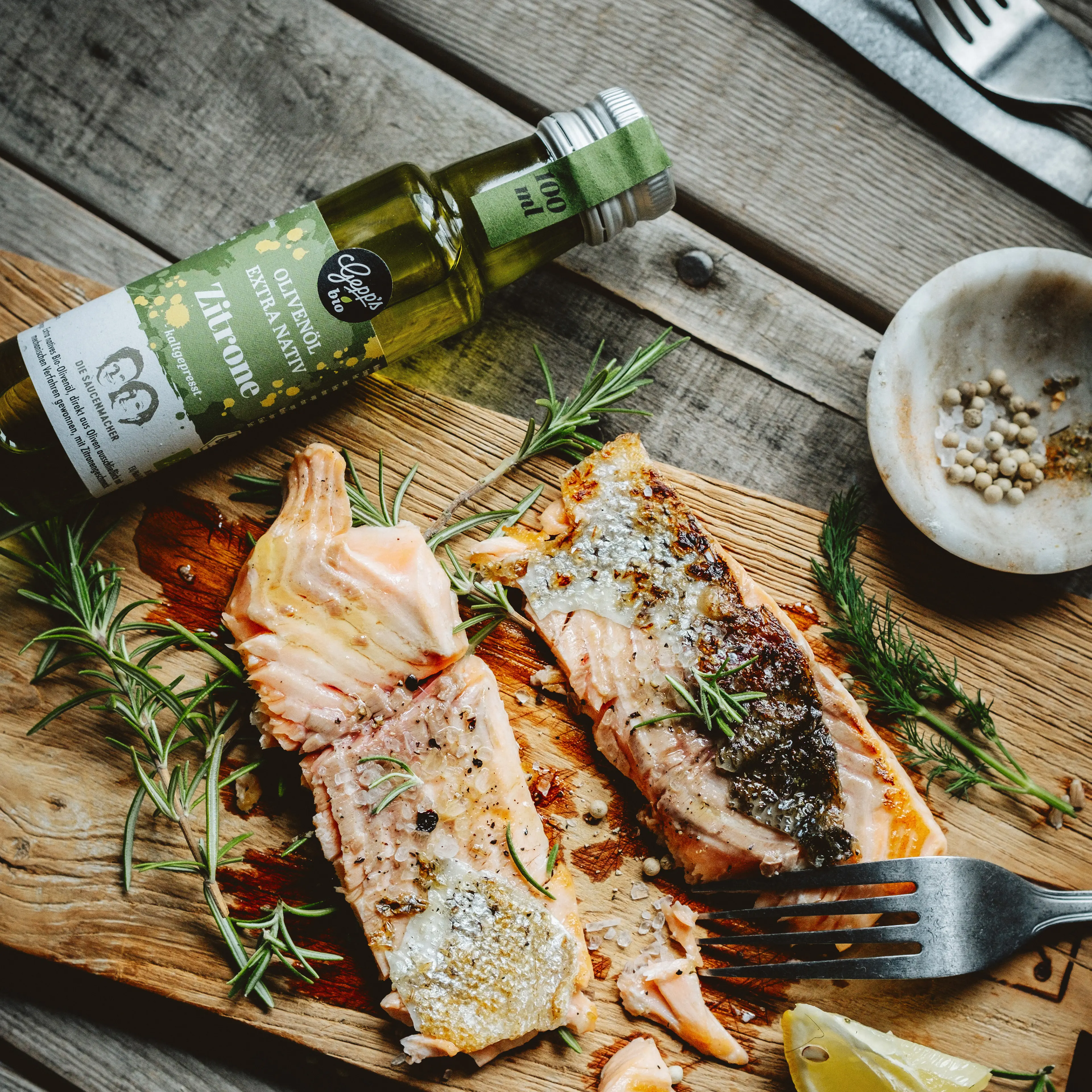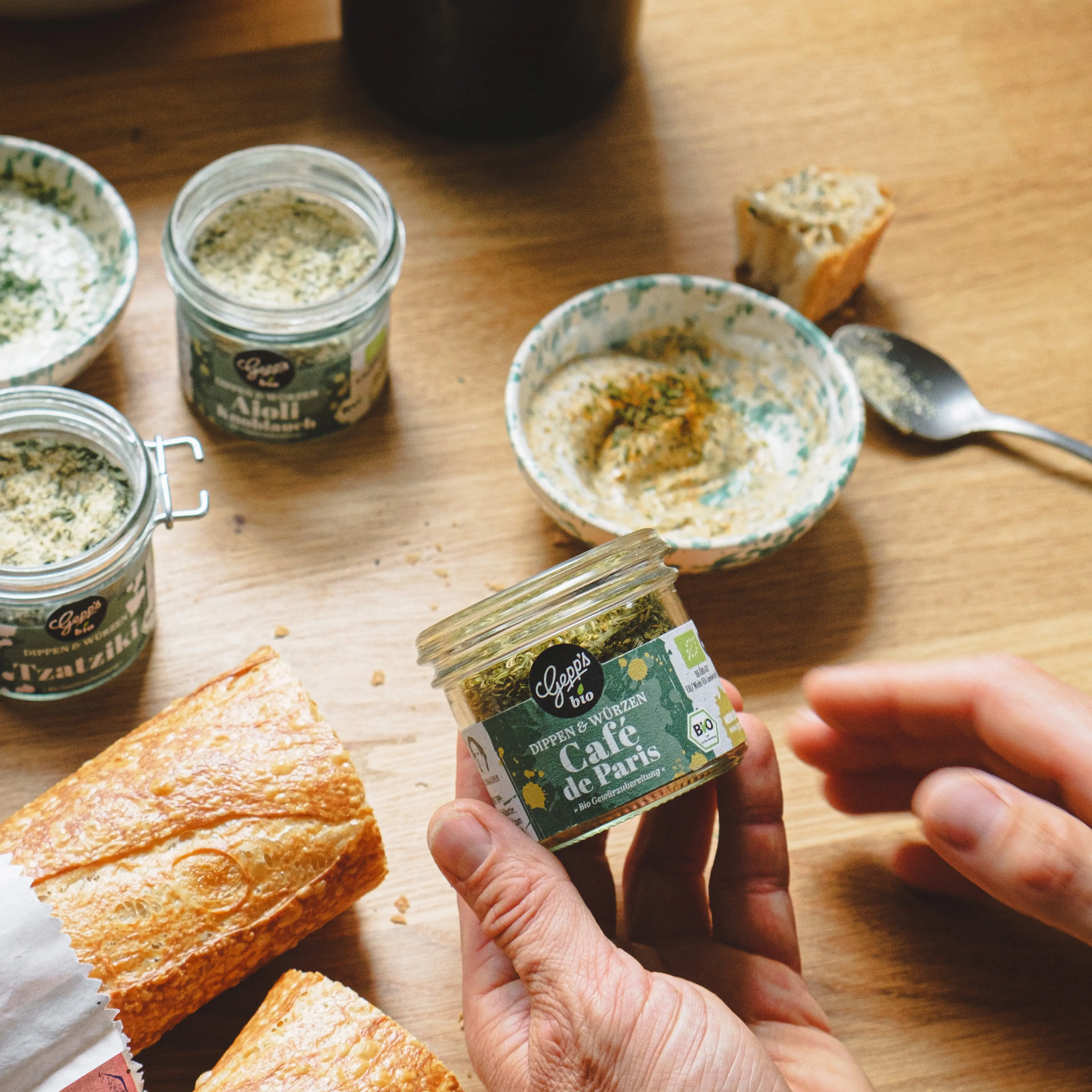 Bio Grissini Natur (125 g), Essigspezialität Kalamansi (40 ml), Bio Olivenöl mit Zitrone (40 ml), Mini Bio Café de Paris (10 g)