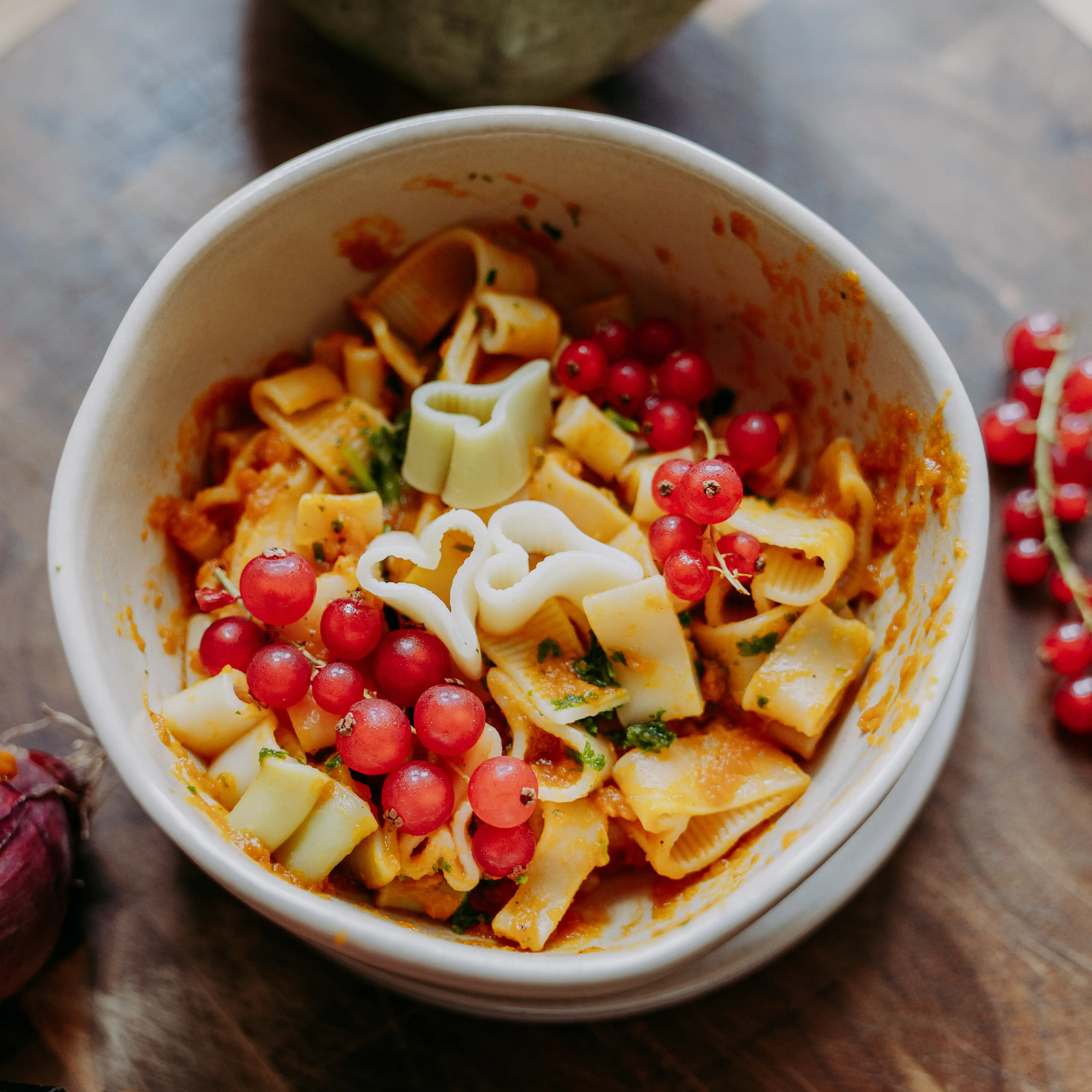 Bio-Pasta Amore (250 g), Tomatensauce Orange-Apérol (250 g), Mini Aufstrich Kokos & Passionsfrucht (50 g), 2x Amaretto Classic (á 20 g)