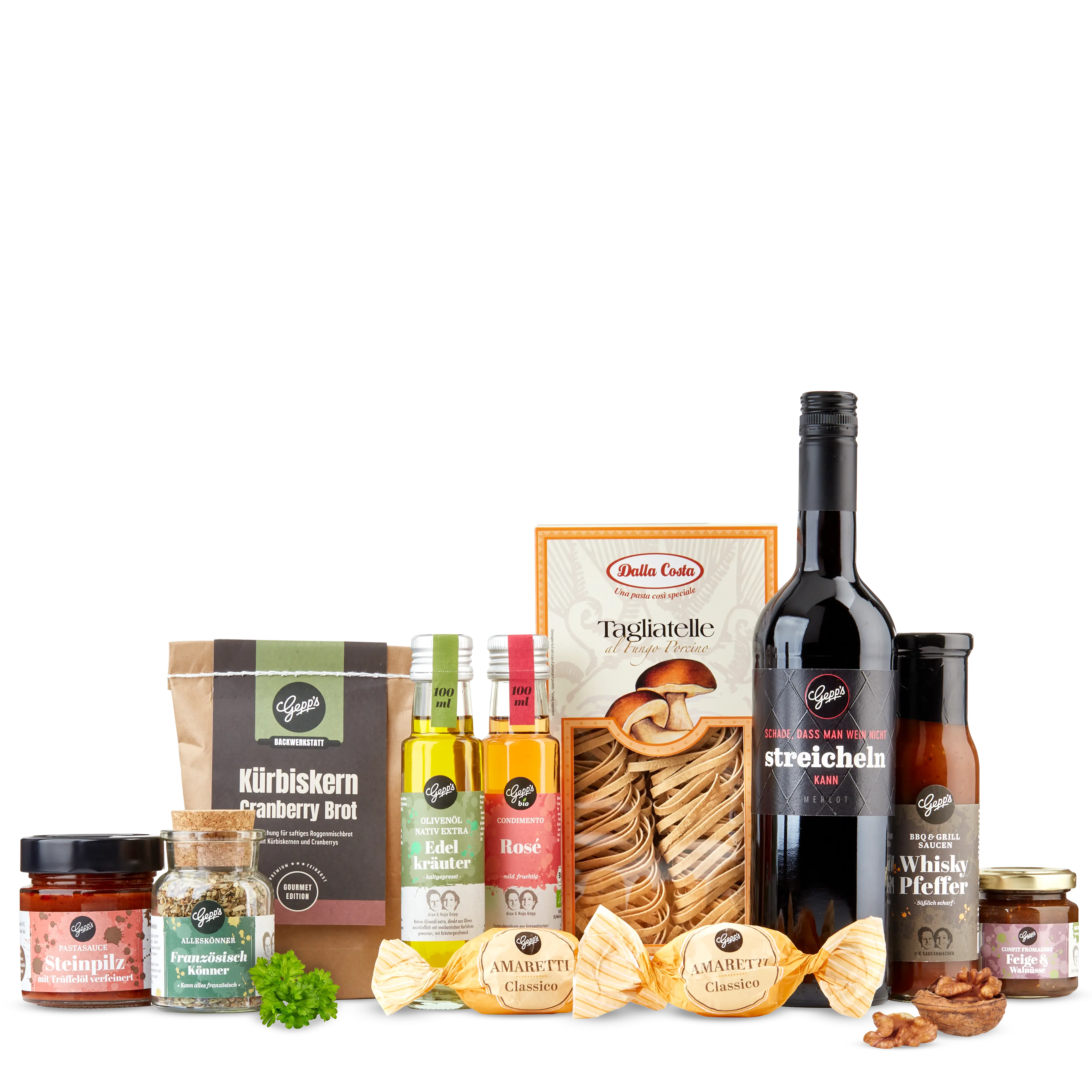 Tagliatelle Steinpilze (250 g), Tomatensauce Steinpilz-Trüffel-Thymian (250 g), Whisky Pfeffer-Sauce (250 ml), Kürbiskern Cranberry- Backmischung (500 g), Gewürzmischung Französisch Alleksönner (55 g), Wein: Merlot "Schade, dass man Wein nicht streicheln kann“ (0,75 l), Bio Essigspezialität Rosé (100 ml), Olivenöl Mit Edelkräutern (100 ml), Confit Feige & Walnuss (125 g), 2x Amaretto Classic (á 20 g)