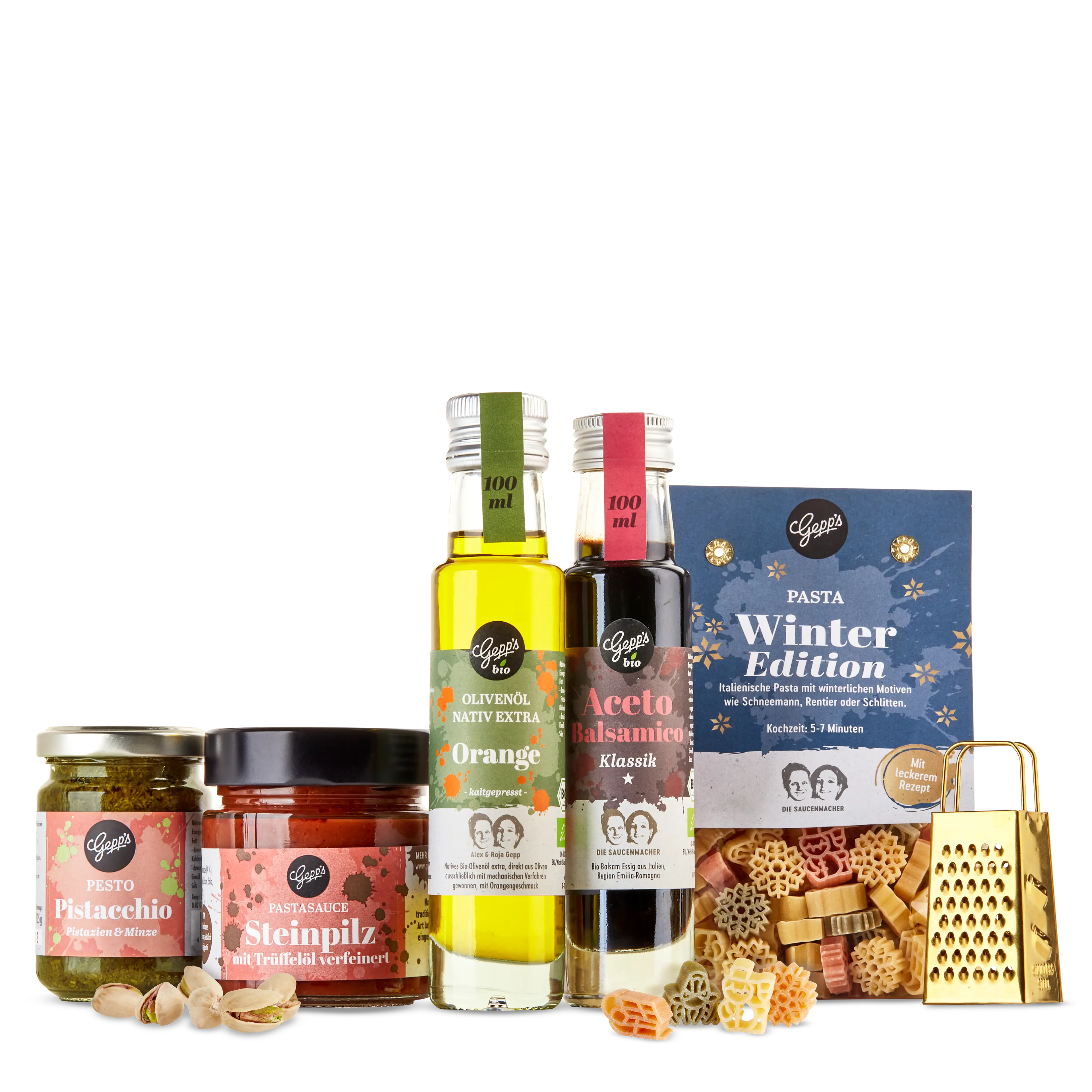 Pasta Winter (250 g), Tomatensauce Steinpilz, Trüffel, Thymian (250 g), Pesto Pistacchio & Minze (135 g), Bio Olivenöl mit Orange (100 ml), Bio Aceto Balsamico Klassik (100 ml), Parmesanreibe Gold