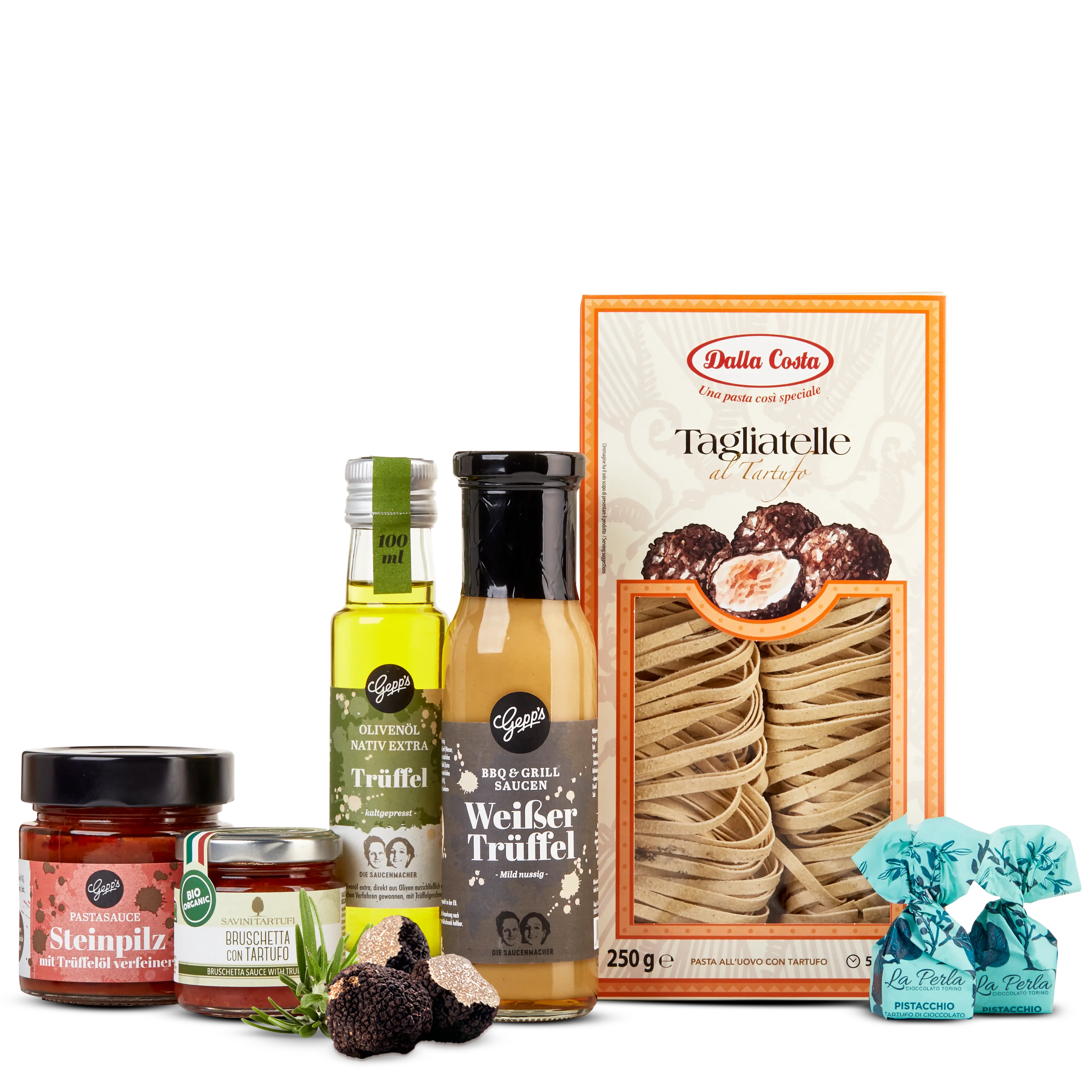 Olivenöl mit weißem Trüffel (100 ml), Weißer Trüffel-Sauce (250 ml), Bio-Bruschetta mit Sommertrüffel (90 g), Tomatensauce Steinpilz, Trüffel und Thymian (250 g), Tagliatelle mit Trüffel (250 g), 2x Tartufo Pistacchio (á 14 g)