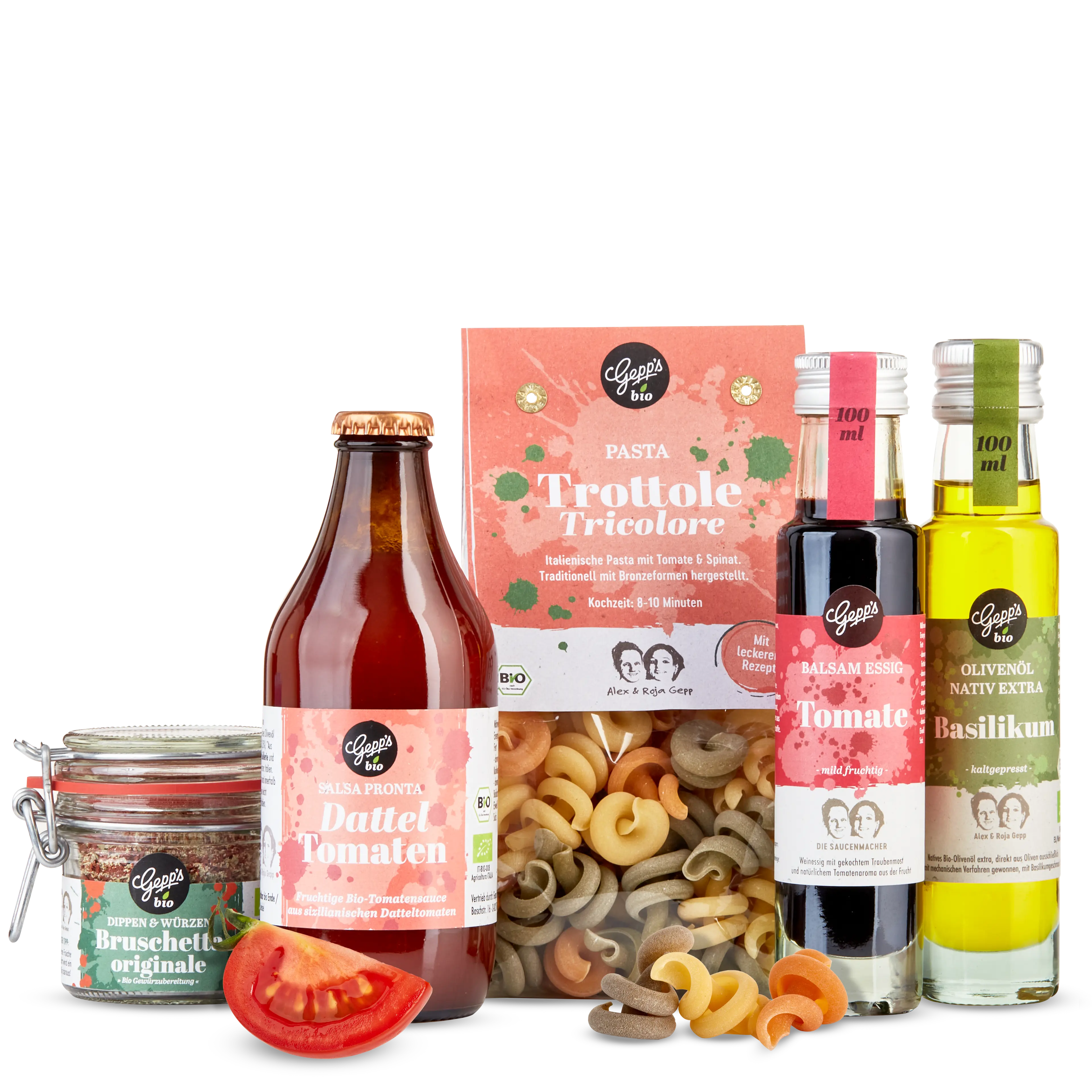 Bio Pasta Trottole Pomodoro e Basilico (250 g), Bio Salsa Pronta Dattel Tomate (330 g), Tomaten Balsam Essig (100 ml), Bio Olivenöl Mit Basilikum (100 ml), Bruschetta Dip (40 g)
