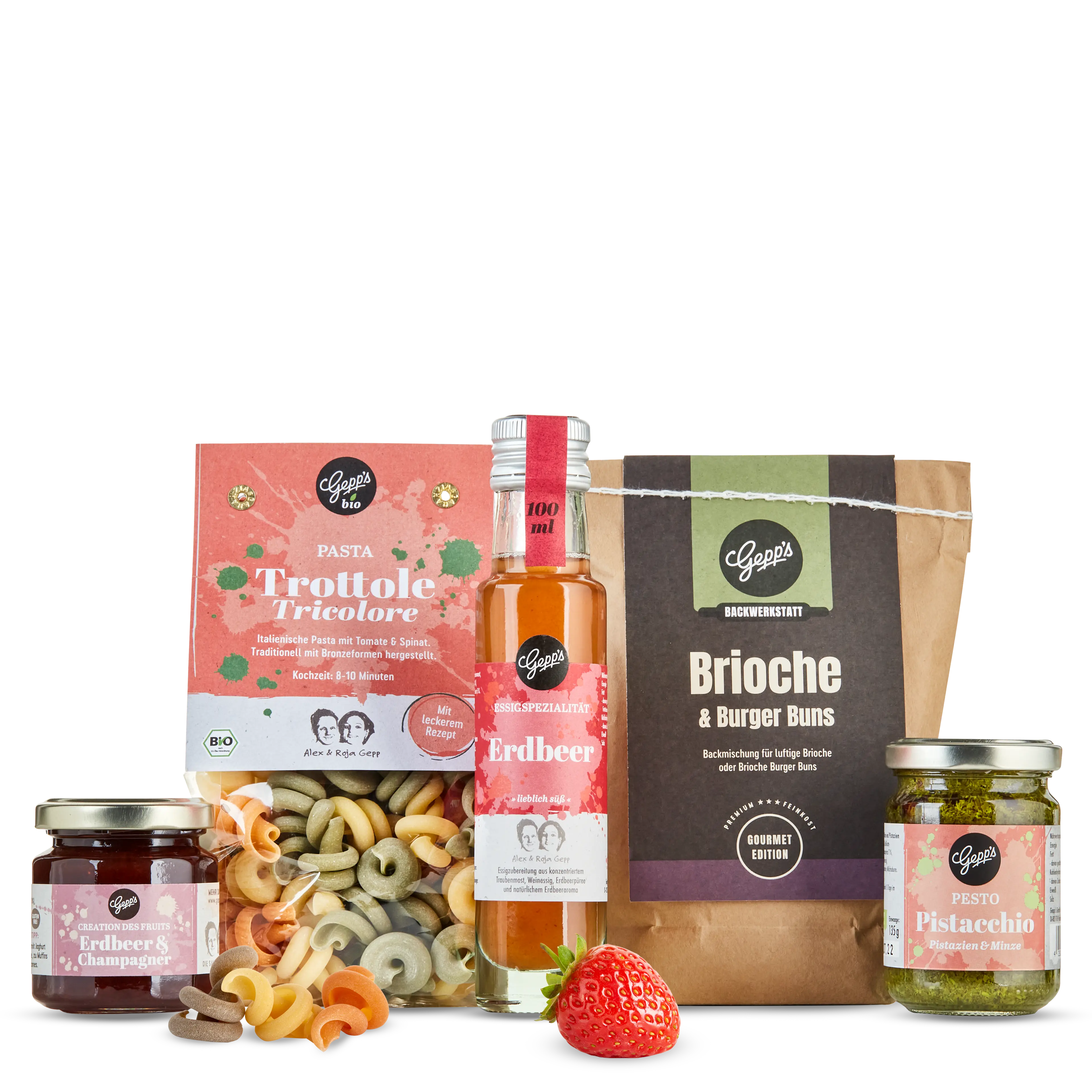 Im Set enthalten: Bio-Pasta Trottole (250 g), Pesto Pistazie und Minze (135 g), Essigspezialität Erdbeer (100 ml), Backmischung Brioche (500 g), Fruchtaufstrich Erdbeer- & Champagner (125 g)