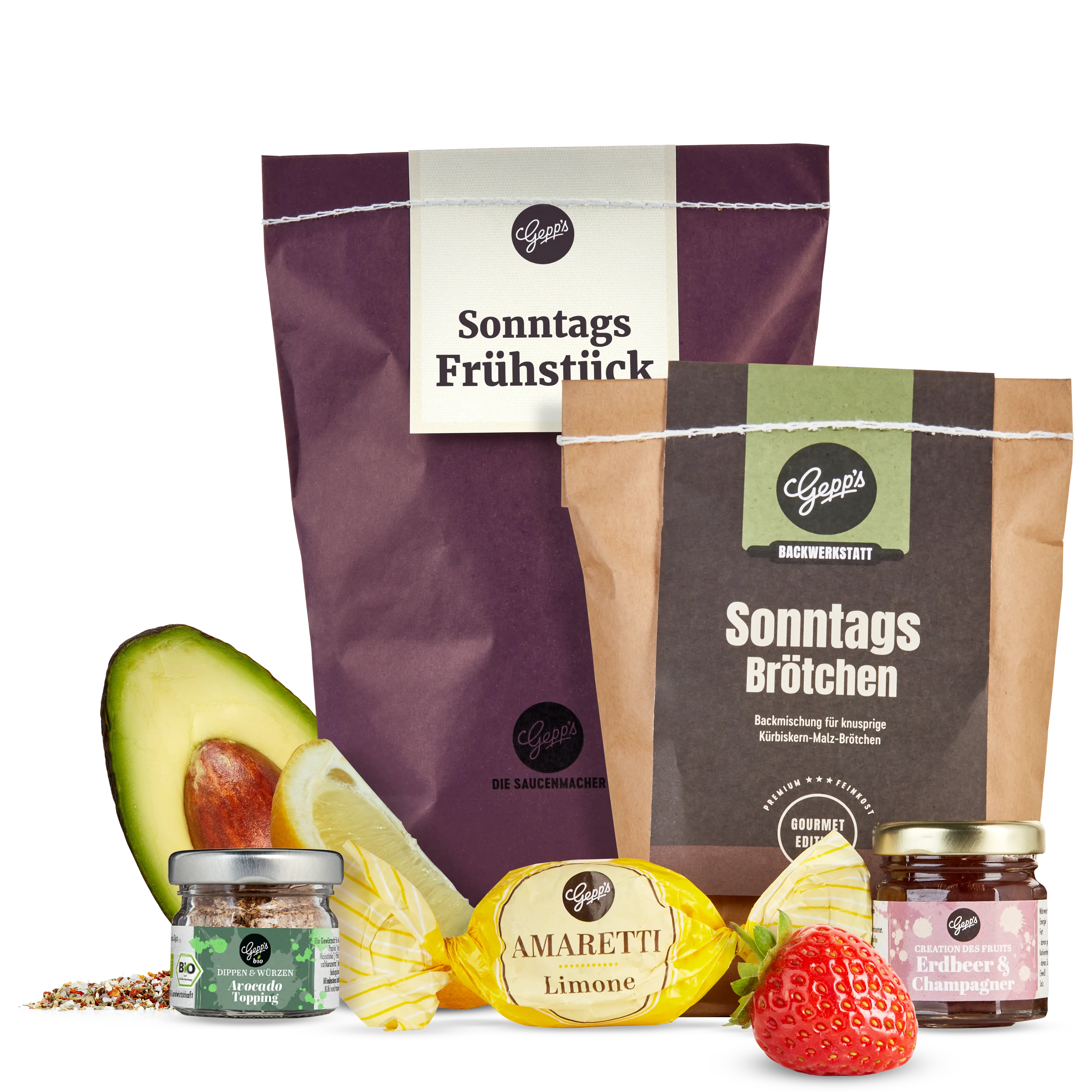 Sonntags ausgiebig und zusammen mit lieben Menschen frühstücken - was gibt es schöneres. Die wichtigen leckeren Dinge haben wir in der Wundertüte zusammengestellt: die Brotbackmischung für knusprige Sonntagsbrötchen, die mit dem feinen Fruchtaufstrich Erdbeere-Champagner köstlich schmecken. Das Avocado-Topping rundet Käse und Salate frisch ab. Amaretti bringen einen Hauch Italien zum Kaffee.