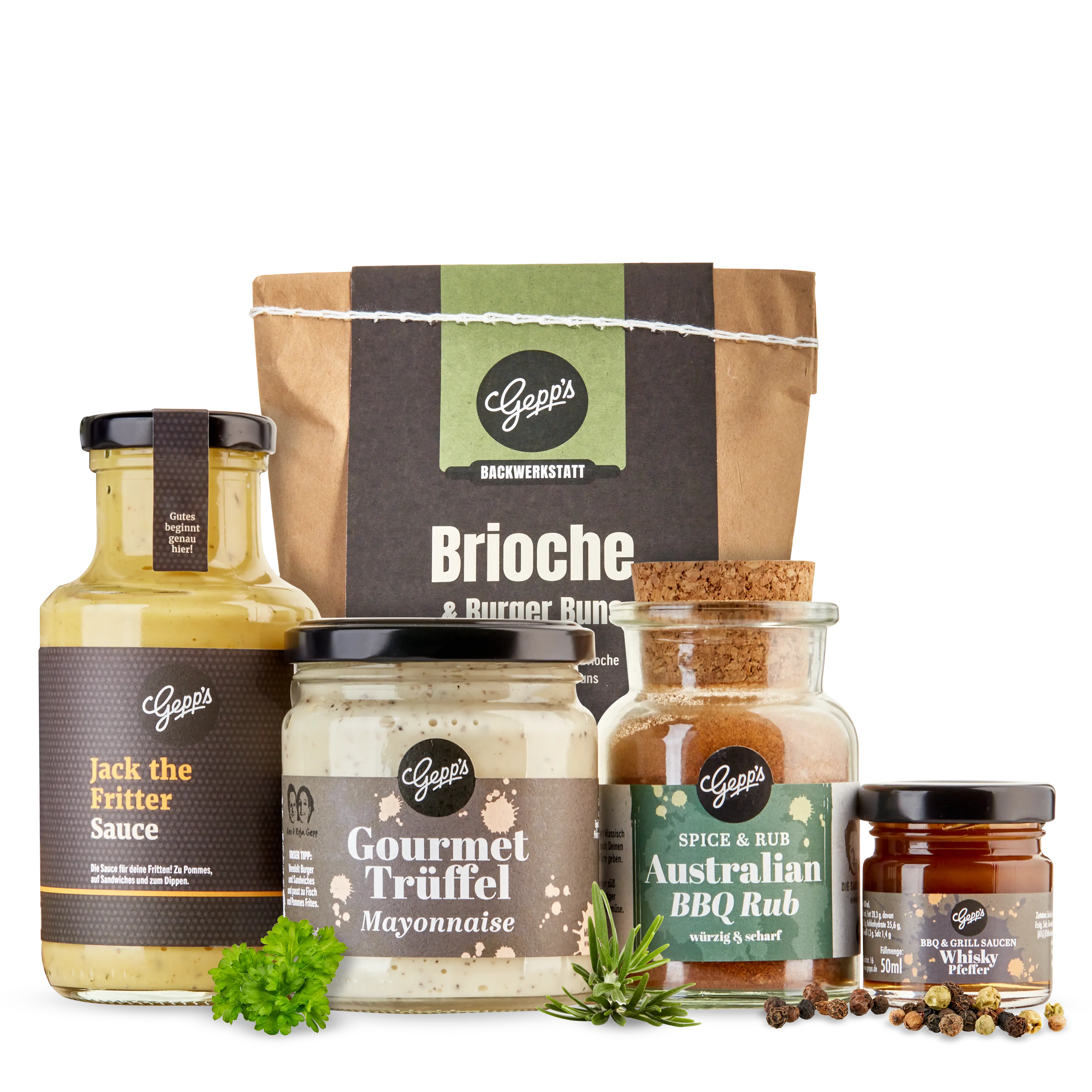 Backmischung Brioche (500 g), Australian BBQ-Rub (95 g), Gourmet Trüffel Mayonnaise (240 ml), Jack The Fritter-Sauce (250 ml), Mini Whisky Pfeffer-Sauce (50 ml)