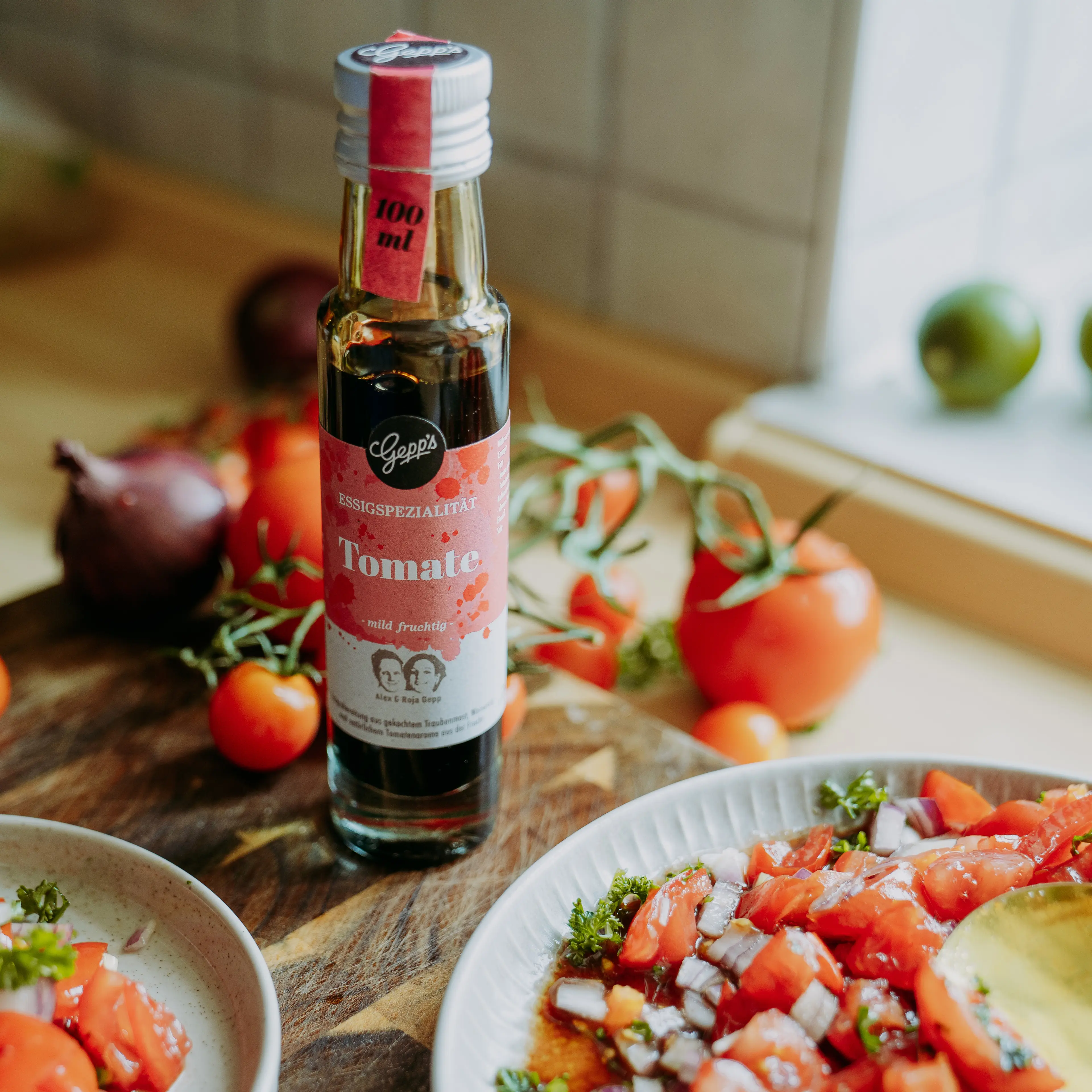 Unsere rote Tomaten Essigspezialität setzt einen echten Sommer-Trend. Mit seinem mild-fruchtigen Aroma vollreif geernteter Tomaten bietet unsere italienische Essigspezialität eine tolle Alternative zum Aceto Balsamico. Er betont alle Gerichte mit Tomate. Wir verwenden ihn gerne als Dressing zu Insalata Caprese und anderen Salaten, zum Marinieren von Rind und Geflügelfleisch sowie zur Verfeinerung von Saucen.