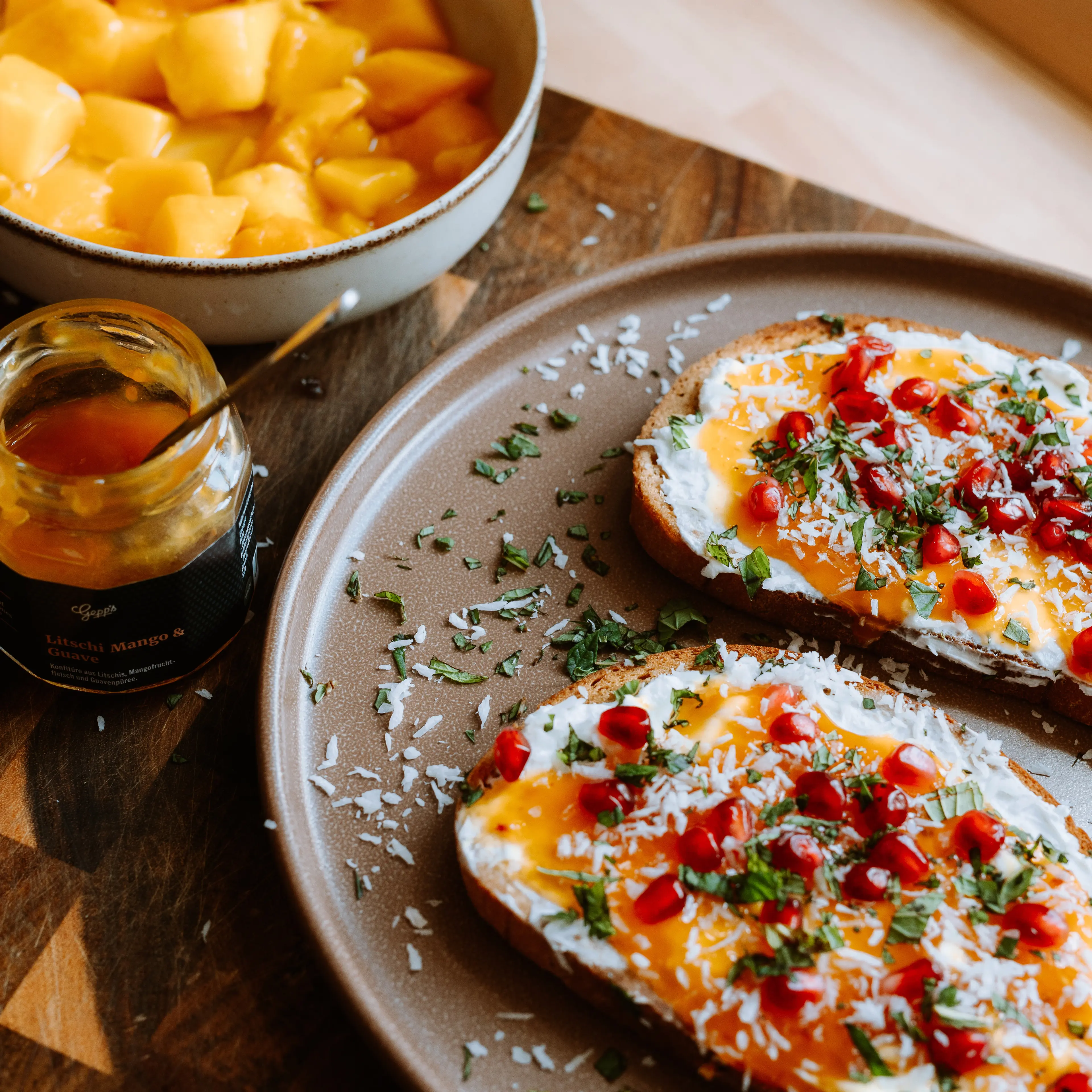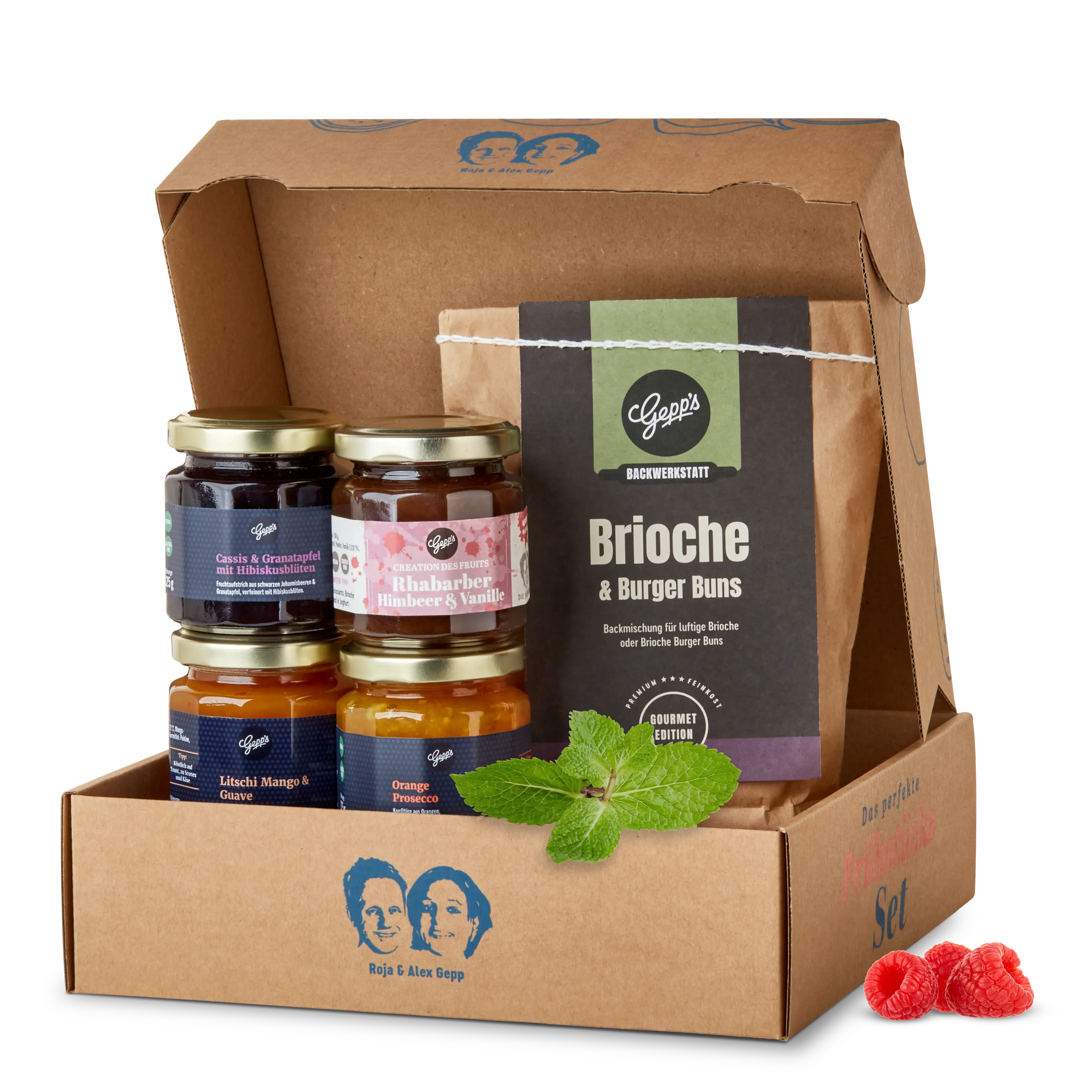 Das perfekte Geschenk für ein genussvolles Sonntagsfrühstück mit deinen Liebsten, verpackt in schöner Schachtel. Zusammen mit Trockenhefe, Butter, Milch und Ei zauberst du mit der Backmischung zarte, fluffige und ofenwarme Brioches. Mit unserem Fruchtaufstrich Litchi Mango & Guave kommt der Urlaub direkt aufs Frühstücksbrötchen. Im der Konfitüre Orange & Prosecco trifft die leichte Säure der Orange auf die spritzige Note des Proseccos und macht diesen Aufstrich zum perfekten Begleiter für besondere Frühstücke, festliche Brunches oder einfach für den Moment, in dem du dir selbst etwas gönnen willst. Der Fruchtaufstrich aus Rhabarber, Himbeere und Vanille ist eine verführerisch-fruchtige Mischung aus Süße und Säure der perfekt aufs Brot oder zum Croissant passt. Mit der Confitüre Cassis, Granatapfel & Hibiskusblüten kommen drei Charaktere ins Glas: die intensive Cassis, der geheimnisvolle Granatapfel und die zarte Hibiskusblüte. Gemeinsam ergeben sie ein Geschmackserlebnis, das überrascht – fruchtig, leicht herb und mit einem floralen Finish, das lange nachklingt.