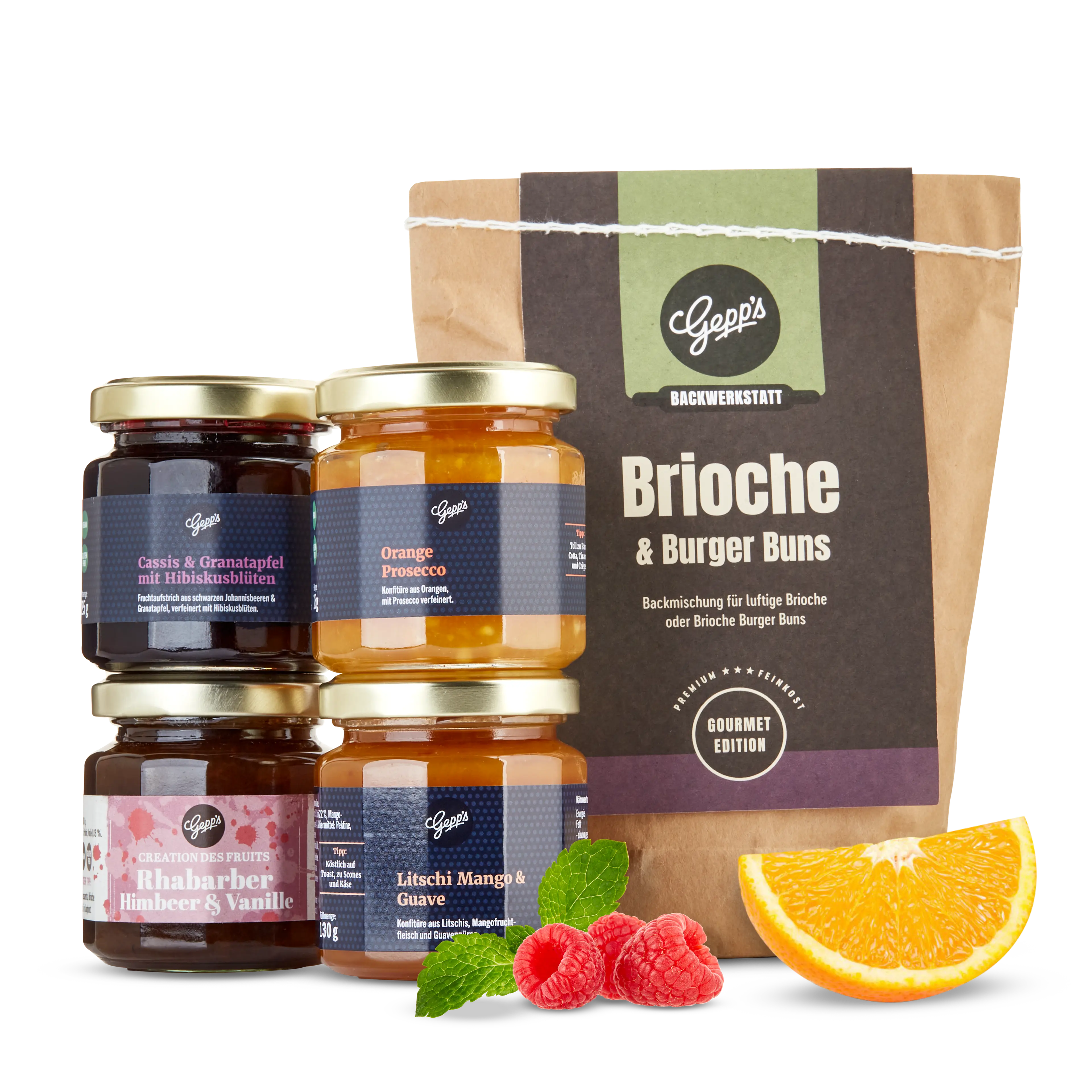 Brioche-Backmischung (500g), Fruchtaufstrich Rhabarber & Himbeere (125g), Konfitüre Orange Prosecco (125g), Konfitüre Litschi Mango & Guave (125g), Konfitüre Cassis, Granatapfel und Hibiskusblüten (125g)