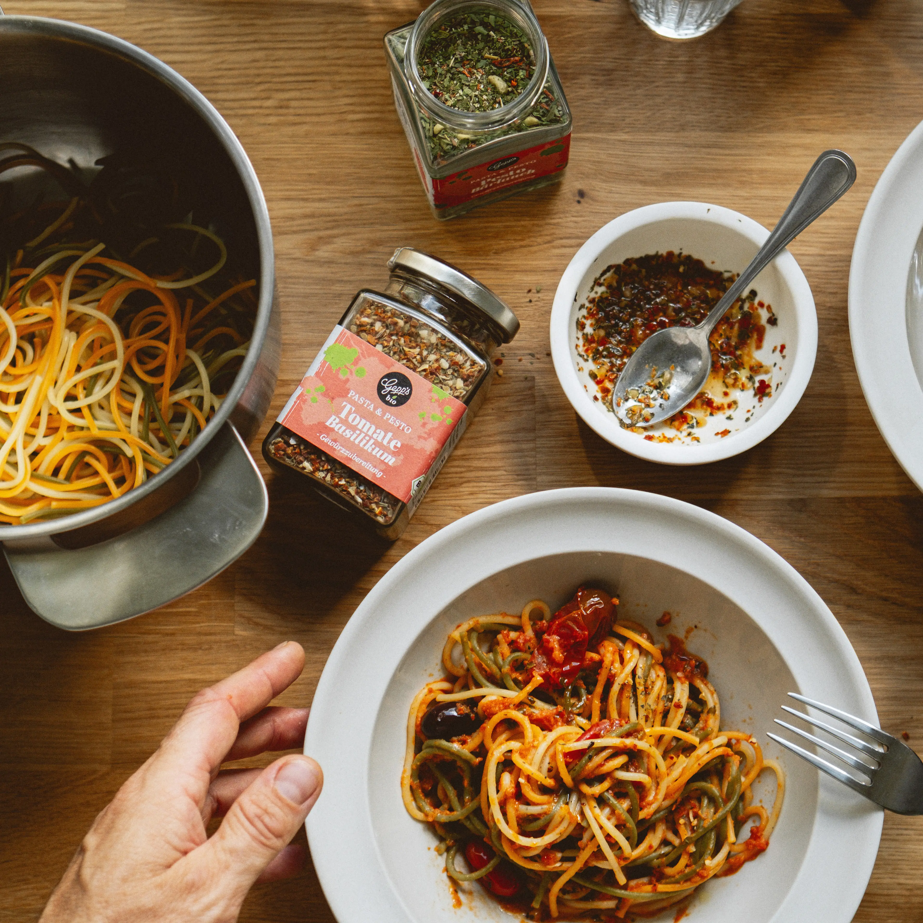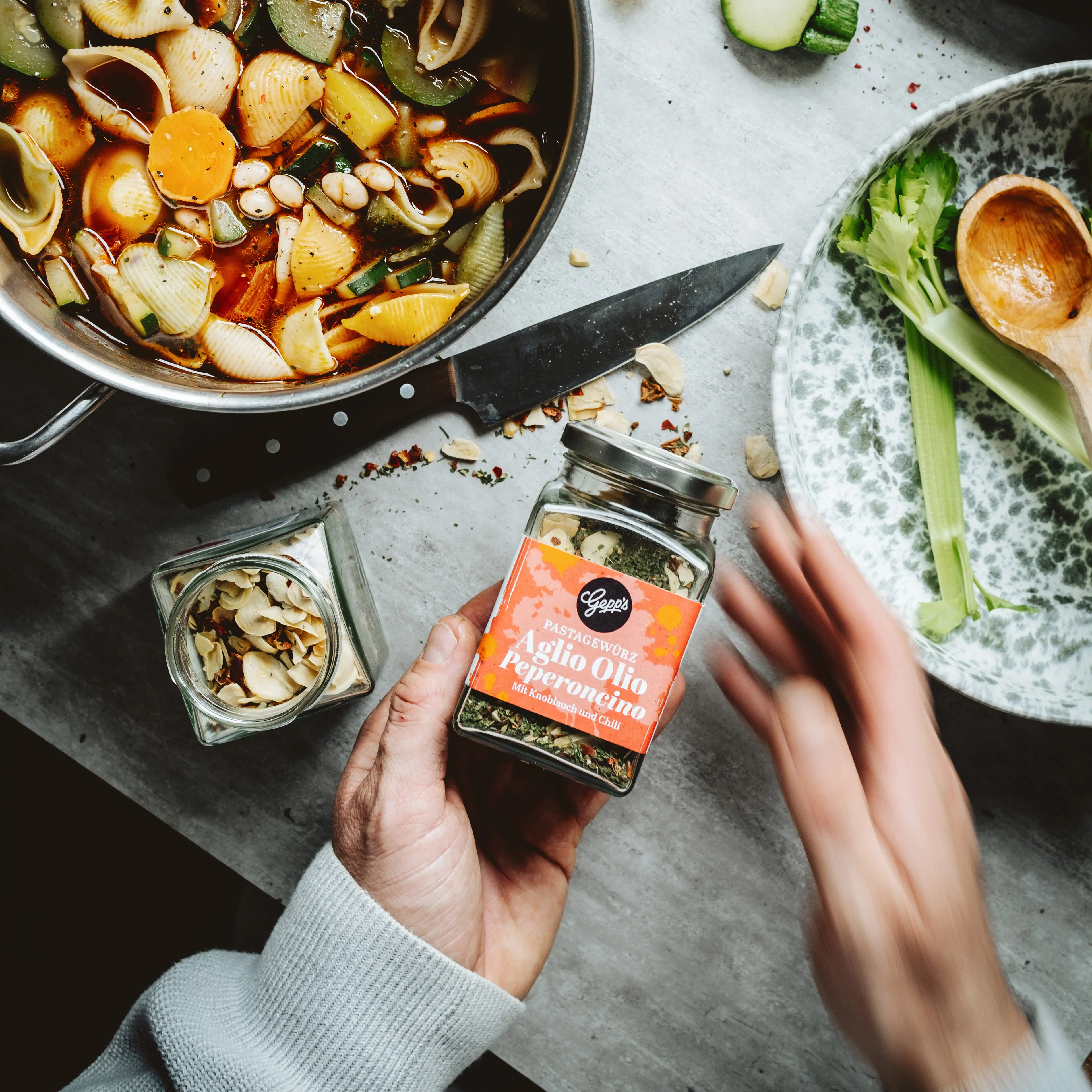 - Gefüllt mit Pasta und Pesto, Gewürzen, Olivenölen und mehr