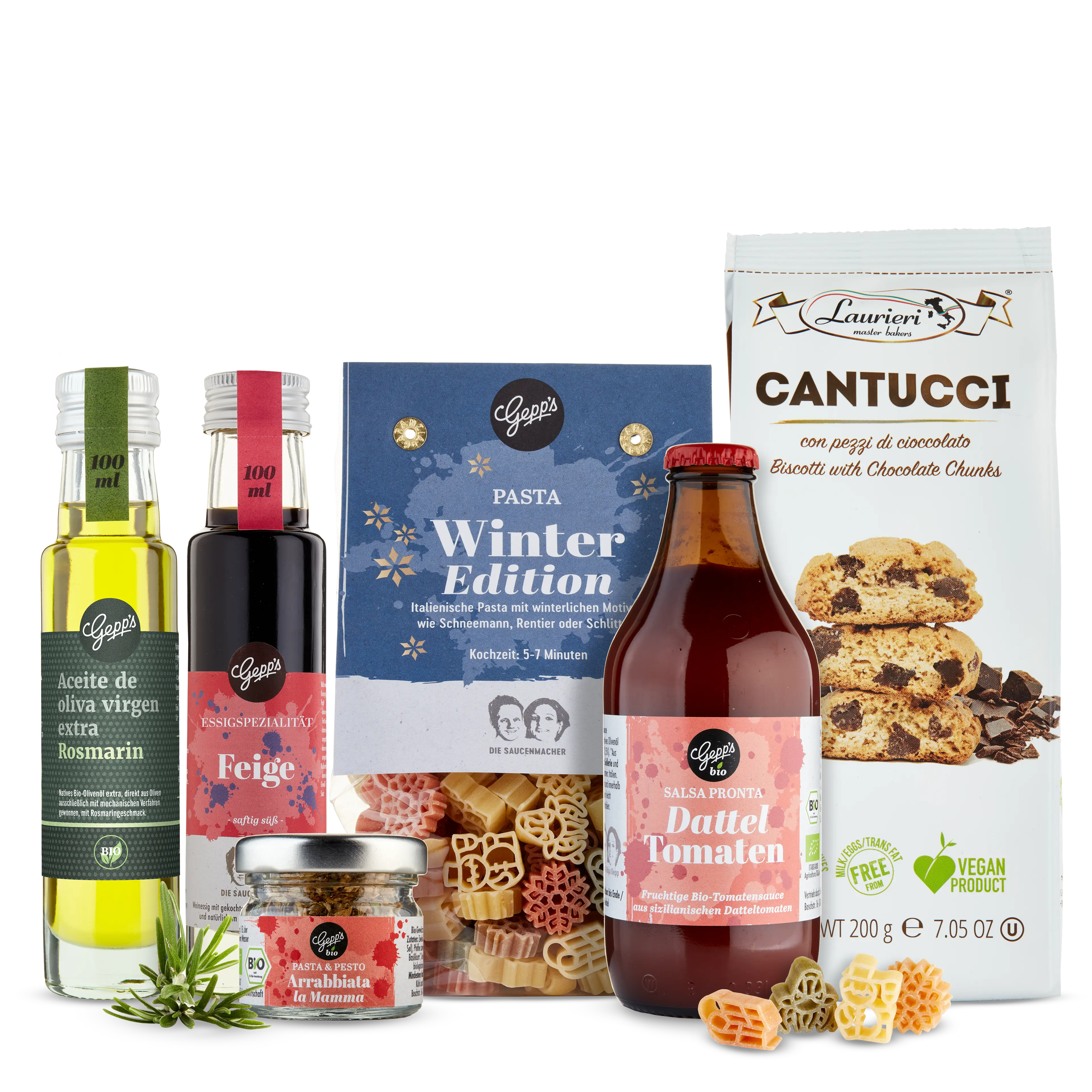 Pasta Winter (250 g), Bio Salsa Pronta Dattel Tomate (330 g), Cantuccini alle Mandorle (200 g), Feigen Balsam-Essig (100 ml), Bio Olivenöl mit Rosmarin (100 ml), Mini Bio Arrabiata Pastagewürz (8 g)
