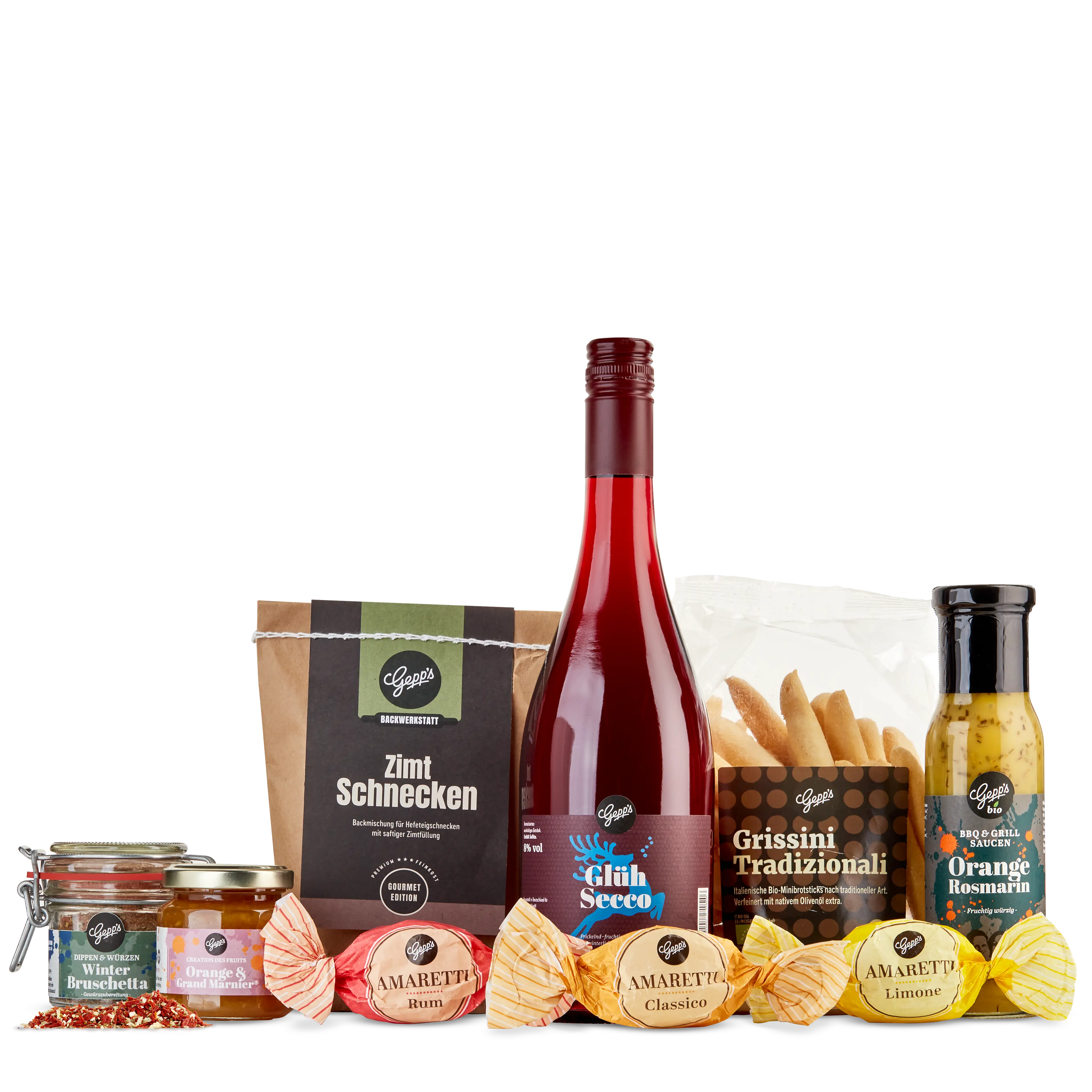 Backmischung Zimtschnecke (500 g), Süßorange Grand Manier-Fruchtaufstrich (125 g), Bio-Orange Rosmarin-Sauce (250 ml), Winter Bruschetta-Dip (40 g), Grissini Natur (125 g), Glühsecco (0,75 l), Amaretti Klassik (20 g), Amaretti Rum (20 g), Amaretti Limone (20 g)