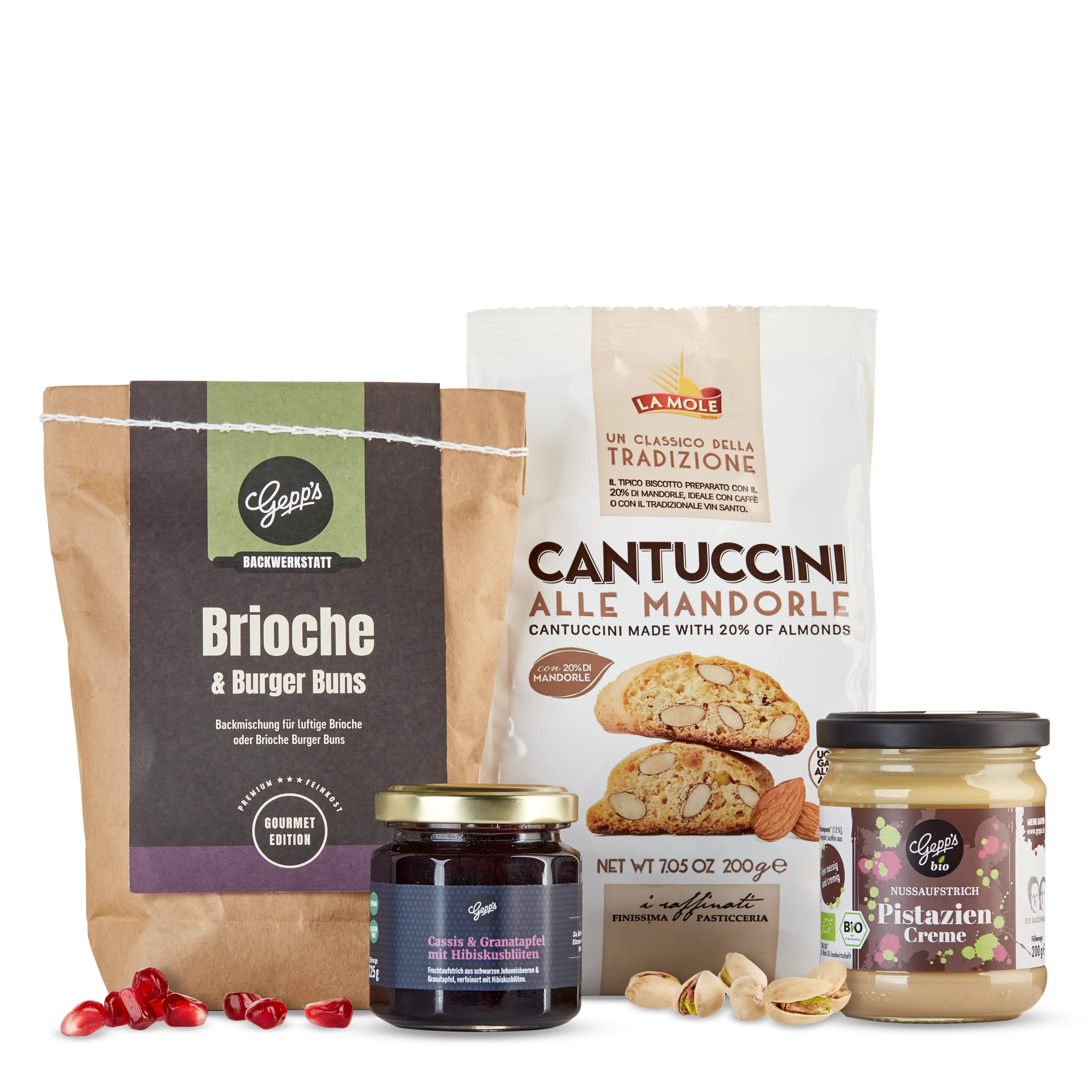 Cantuccini alle Mandorle (200 g), Backmischung Brioche (500 g), Cassis & Granatapfel Fruchtaufstrich (125 g), Bio Pistazien Creme (200 g)