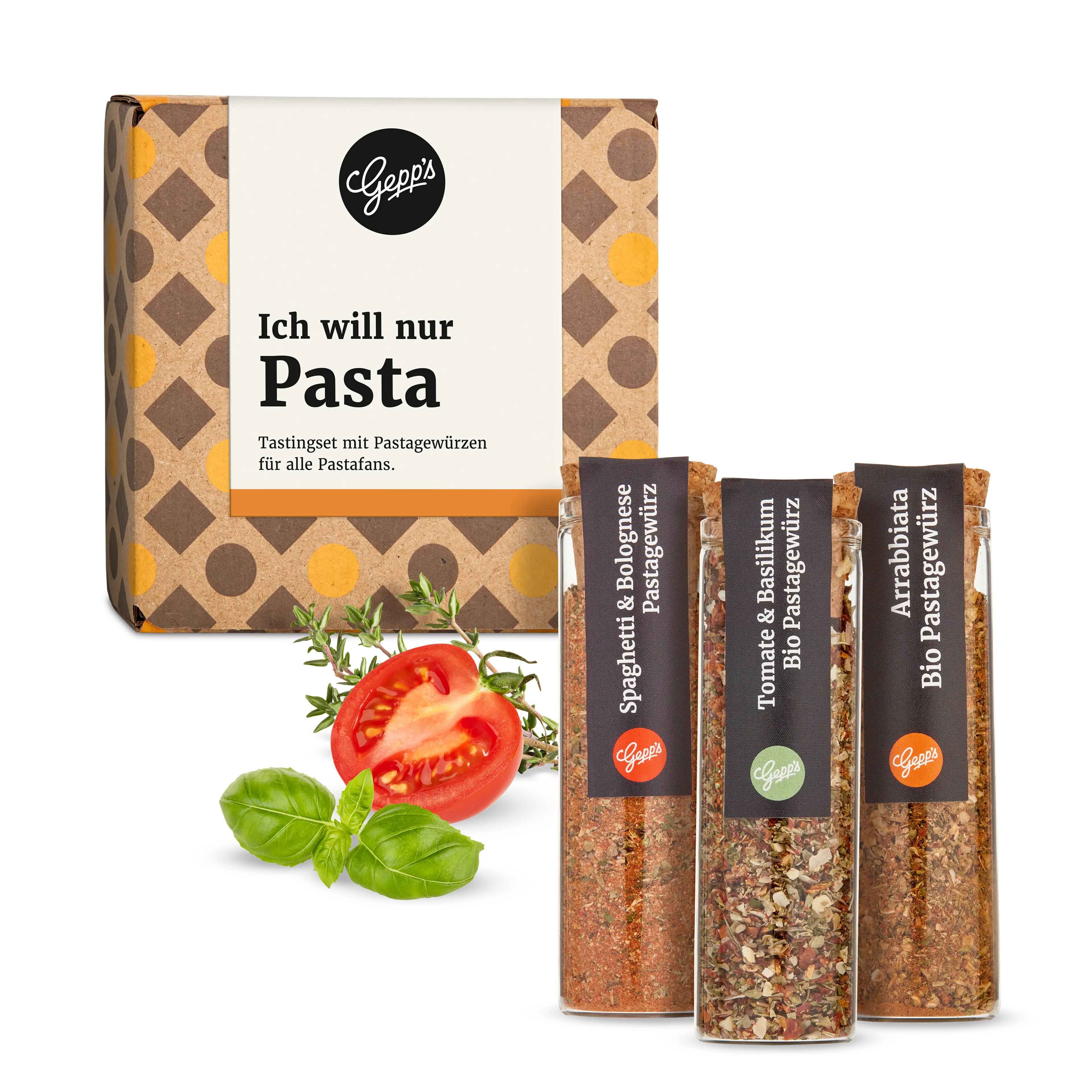 Das Set „Ich will nur Pasta“ ist ein Muss für alle, die Nudeln lieben und gerne kreativ würzen. Mit drei ausgewählten Bio-Gewürzmischungen – Tomate Basilikum, Arrabiata und Spaghetti – zauberst du im Handumdrehen köstliche Pastagerichte wie in Italien. Das Tomate Basilikum Gewürz bringt mediterrane Frische auf den Teller, die Arrabiata Mischung sorgt für eine pikante Schärfe, und das Spaghetti Gewürz verleiht klassischen Nudeln das gewisse Etwas. Ob als Topping, zum Verfeinern von Saucen oder für neue Rezeptideen: Diese Gewürze machen Pasta zum Genussmoment. Natürlich in bewährter Gepp’s Bio-Qualität