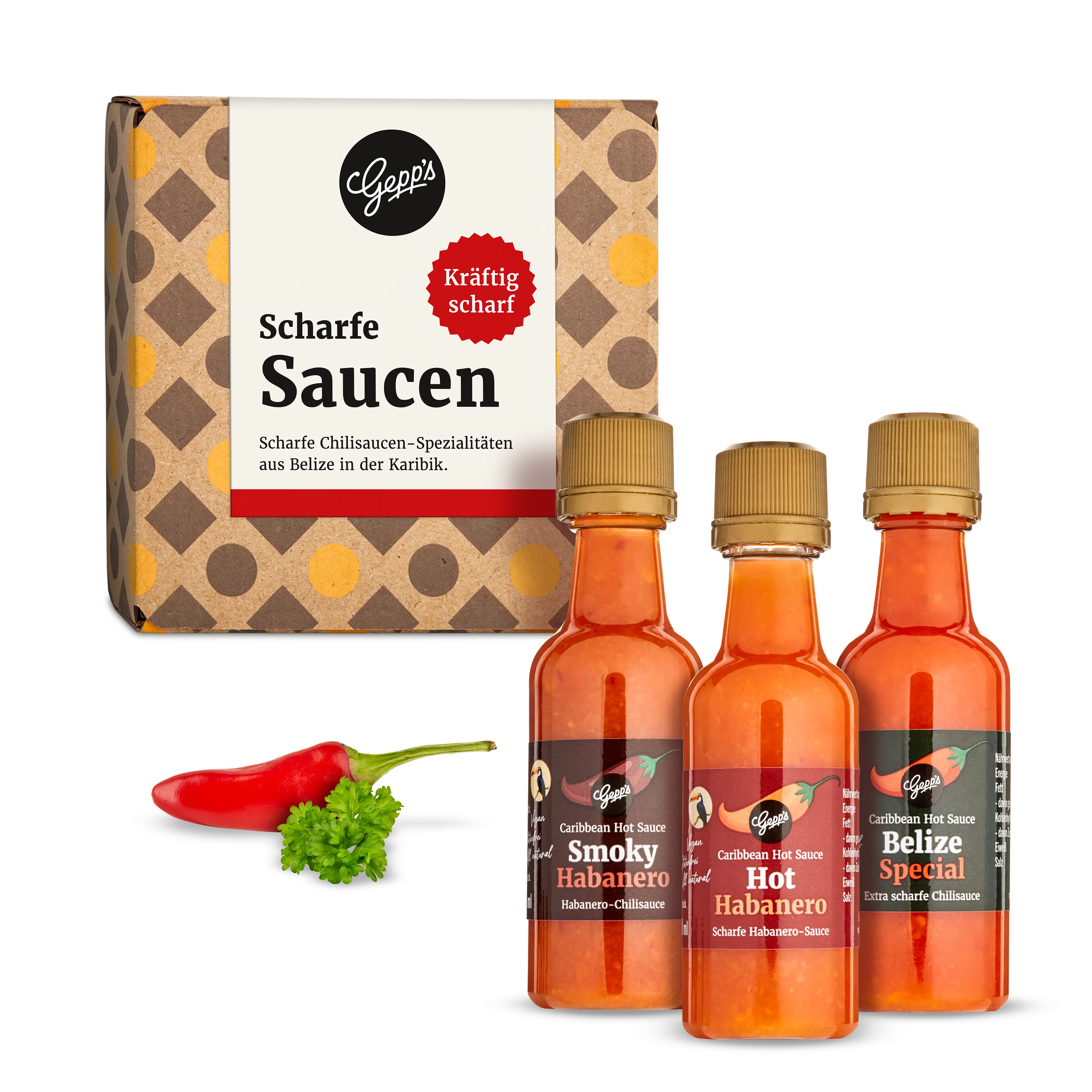 Das Set „Scharfe Saucen“ bringt ordentlich Feuer auf den Tisch! Drei ausgewählte Mini-Saucen aus dem karibischen Belize – Hot Habanero Chili, Belize Special und Smoky Habanero – sorgen für pikante Abwechslung und echte Geschmacksexplosionen. Ob als Dip, zum Verfeinern von Grillgerichten oder als Geheimzutat in deiner Lieblingssauce: Die feurigen Kompositionen sind vielseitig einsetzbar und machen jedes Essen zum Abenteuer. Von rauchig-würzig bis tropisch-fruchtig – hier ist für jeden Chili-Liebhaber das Richtige dabei. Für alle, die es gerne scharf mögen!